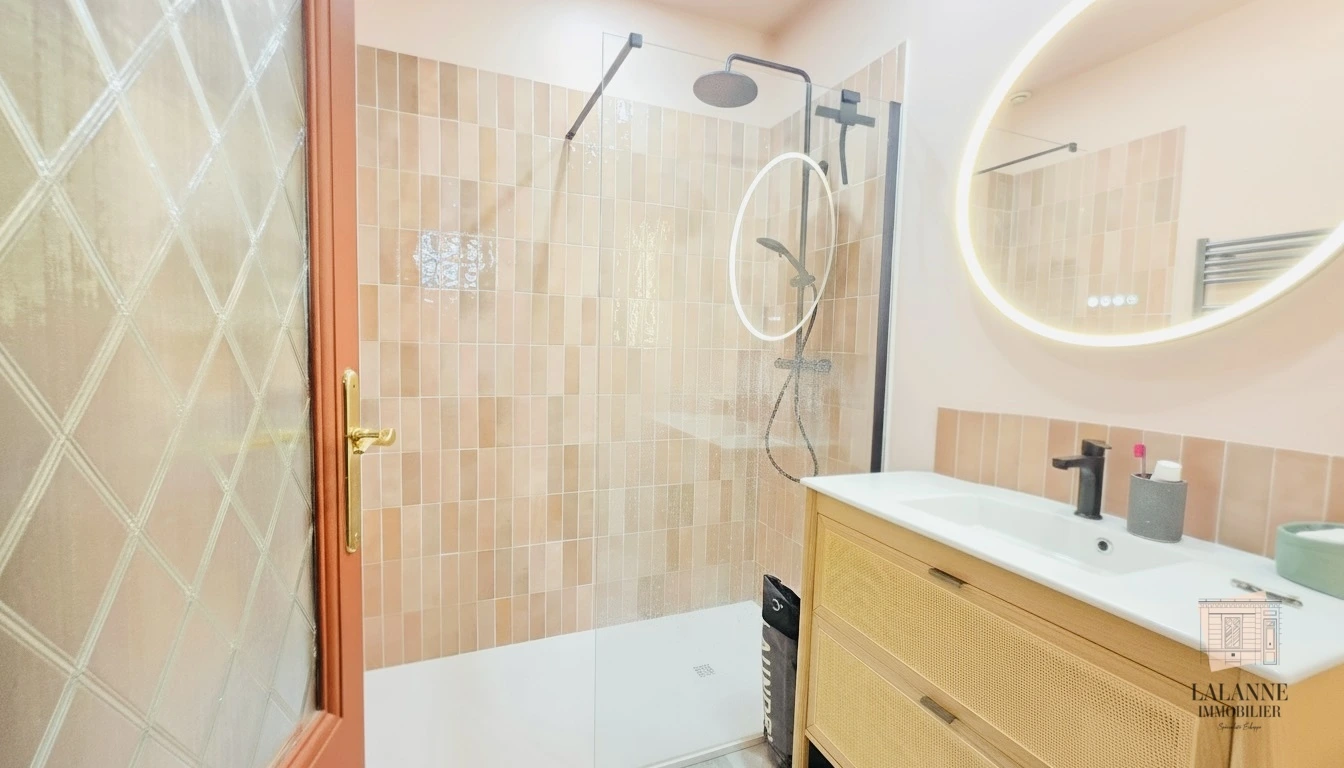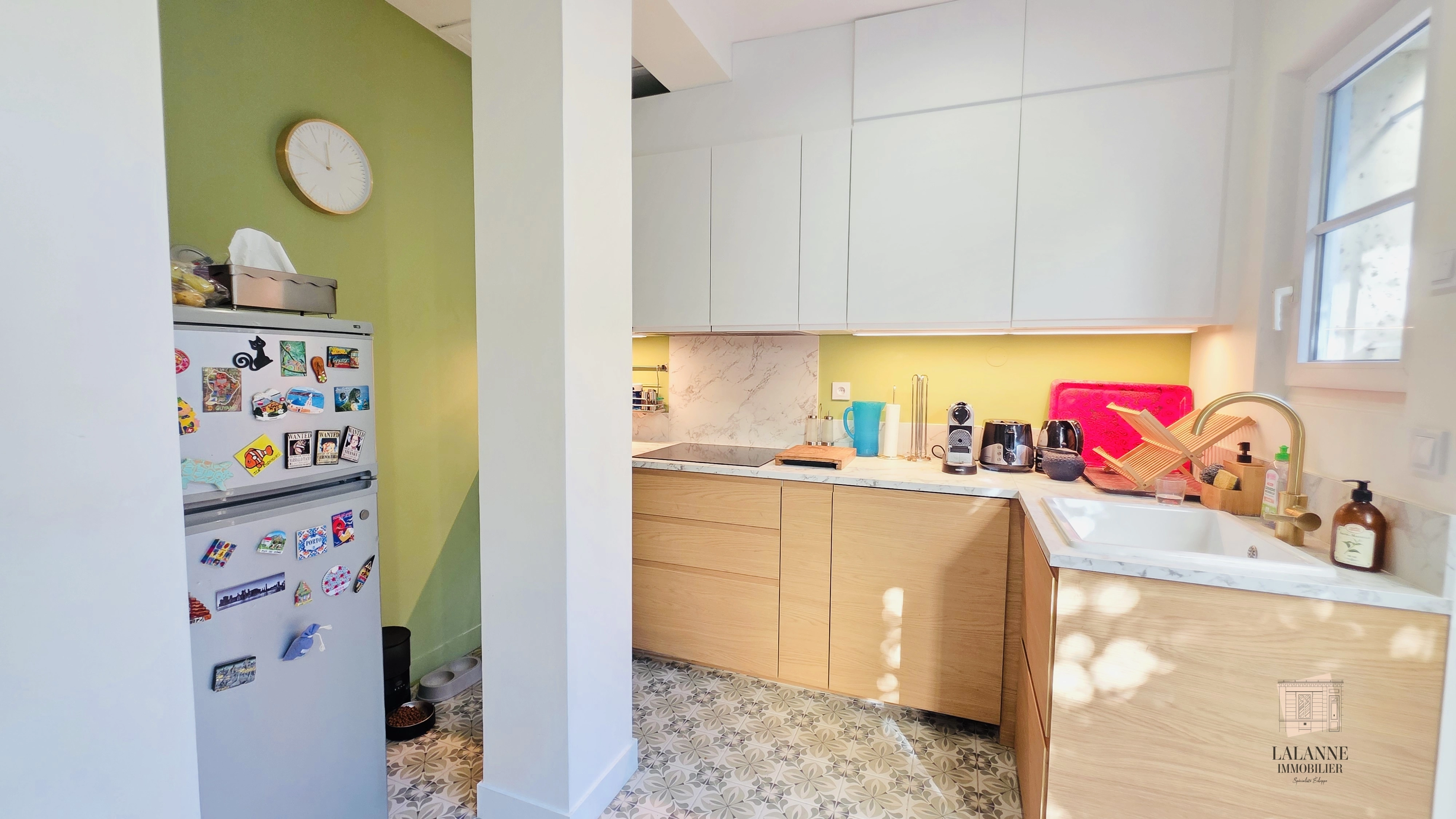 La cuisine, la salle de bain, les sols, les enduits et les peintures des murs ont été complètement refaits à neuf pour dévoiler la nouvelle jeunesse de cette échoppe, qui conserve tout de même les marques du passé faisant son charme, avec sa jolie façade, son mur en pierre bordelaise dans le couloir et son jardin intime à l’arrière. Enfin, la cave saine de 20m² a été transformée en buanderie, ce qui permet d'optimiser pleinement la surface de la maison.