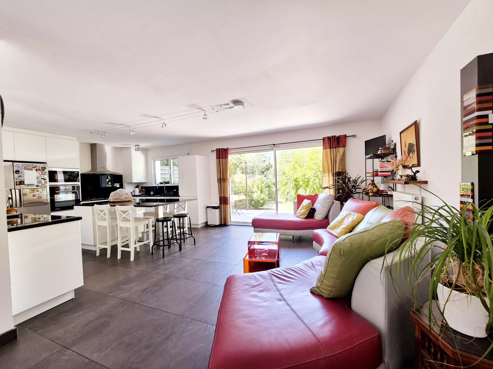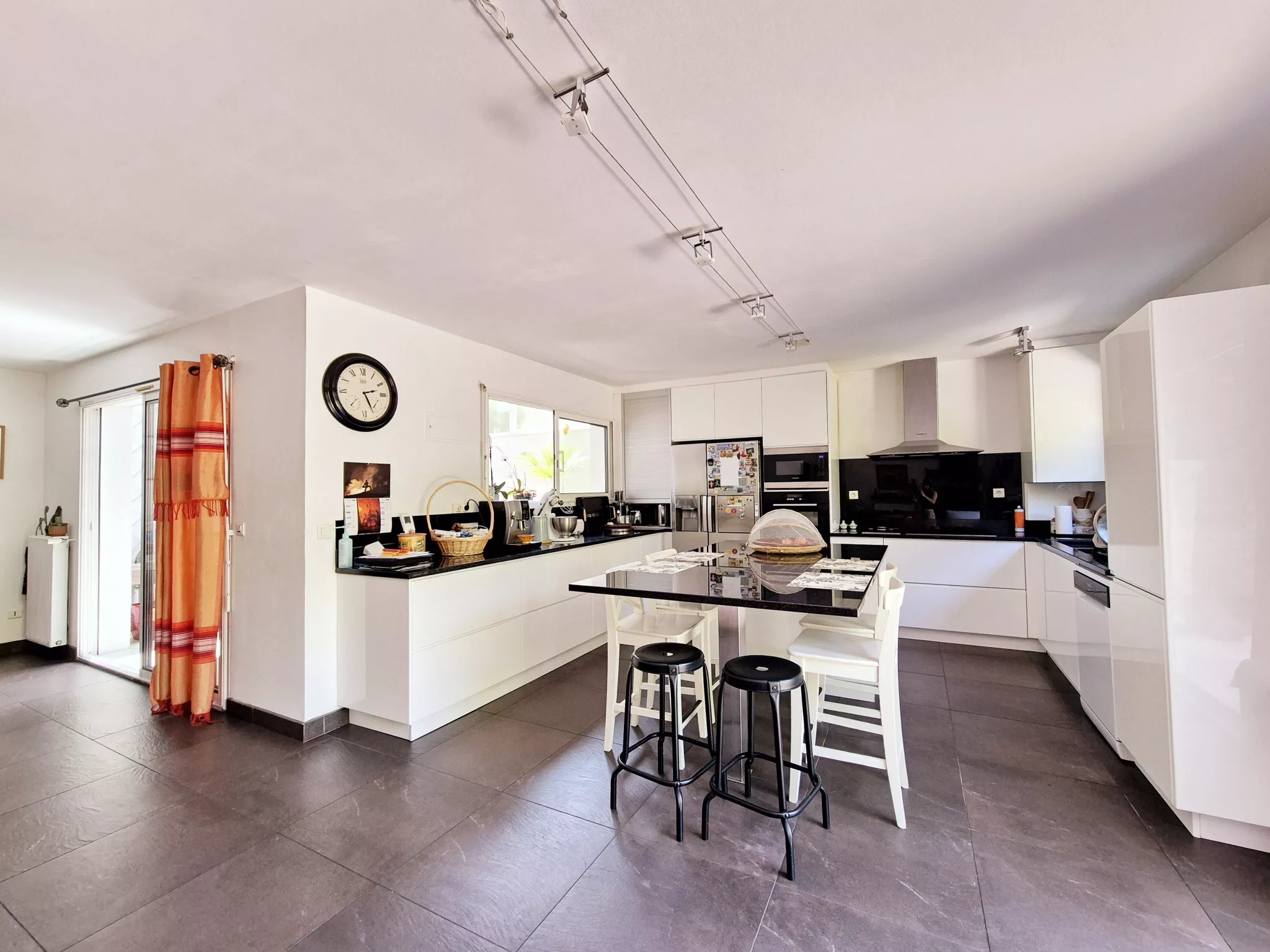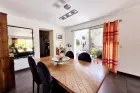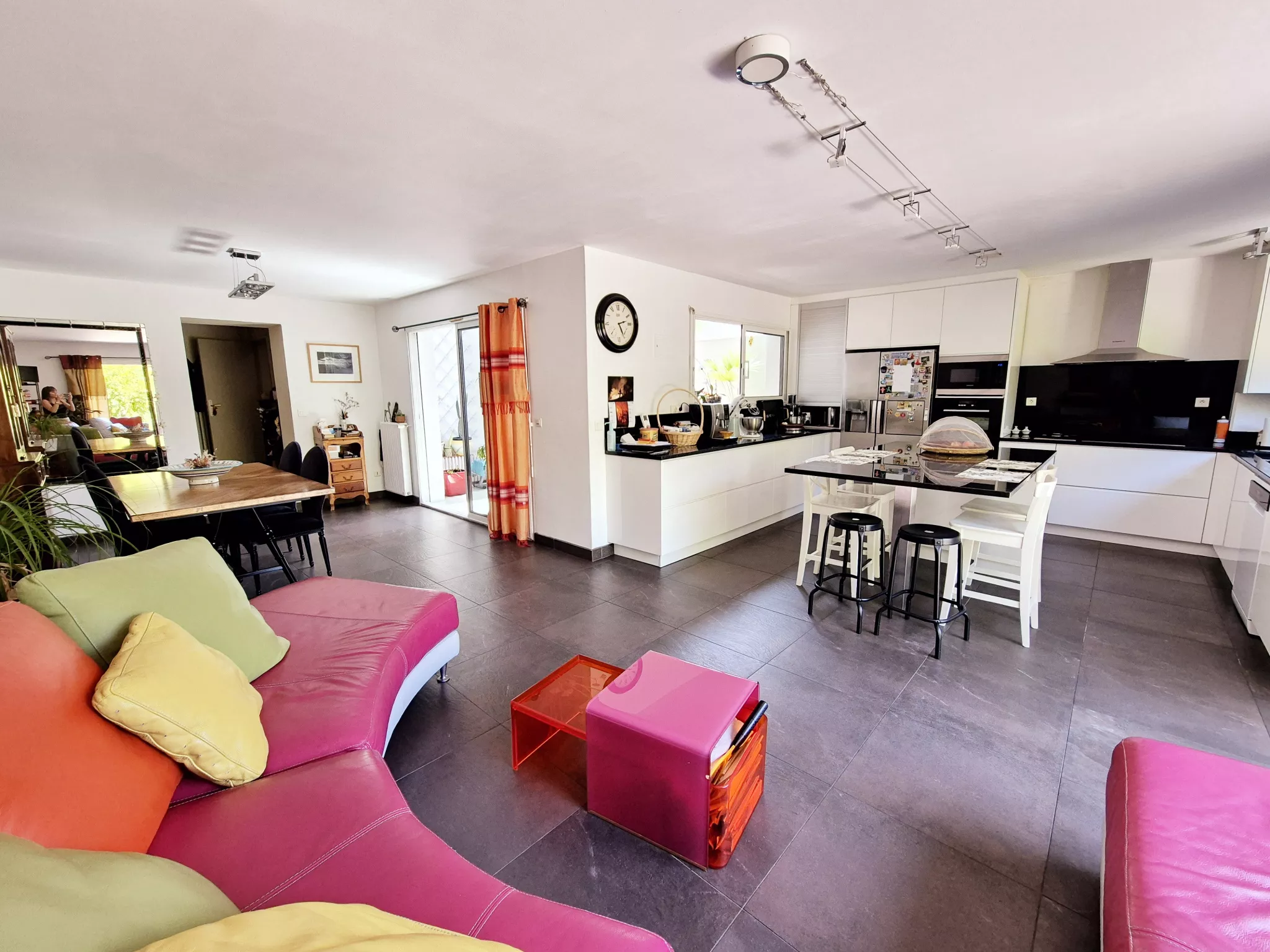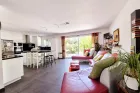 Le salon et la cuisine moderne et conviviale et de très bonne facture ouvre sur un jardin de 200 m2, arboré sans vis à vis et bénéficiant d'une agréable exposition sud-ouest, garantissant luminosité et tranquillité.