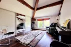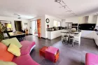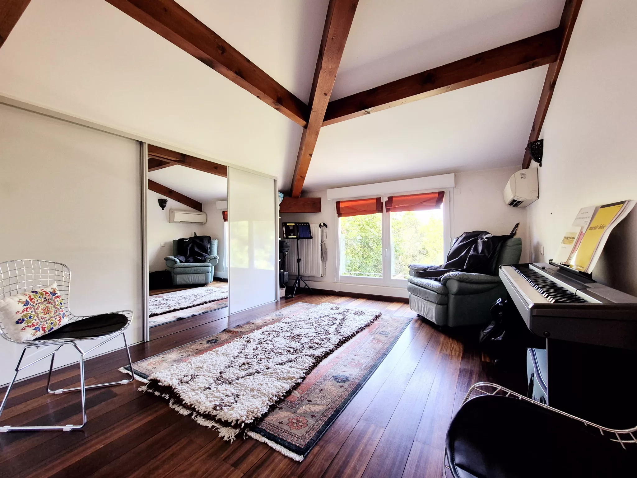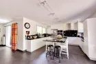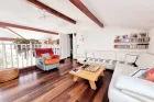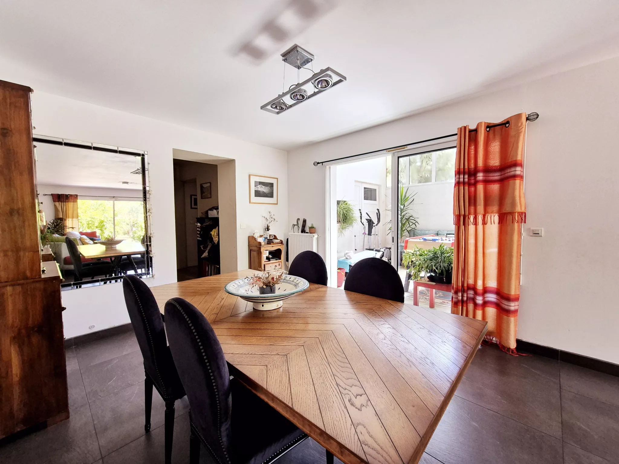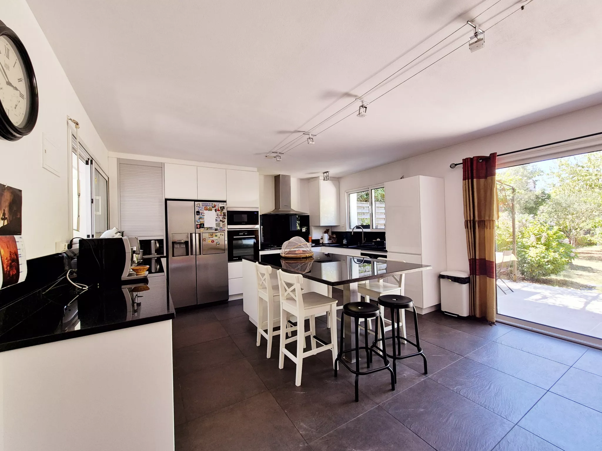 Le salon et la cuisine moderne et conviviale et de très bonne facture ouvre sur un jardin de 200 m2, arboré sans vis à vis et bénéficiant d'une agréable exposition sud-ouest, garantissant luminosité et tranquillité.