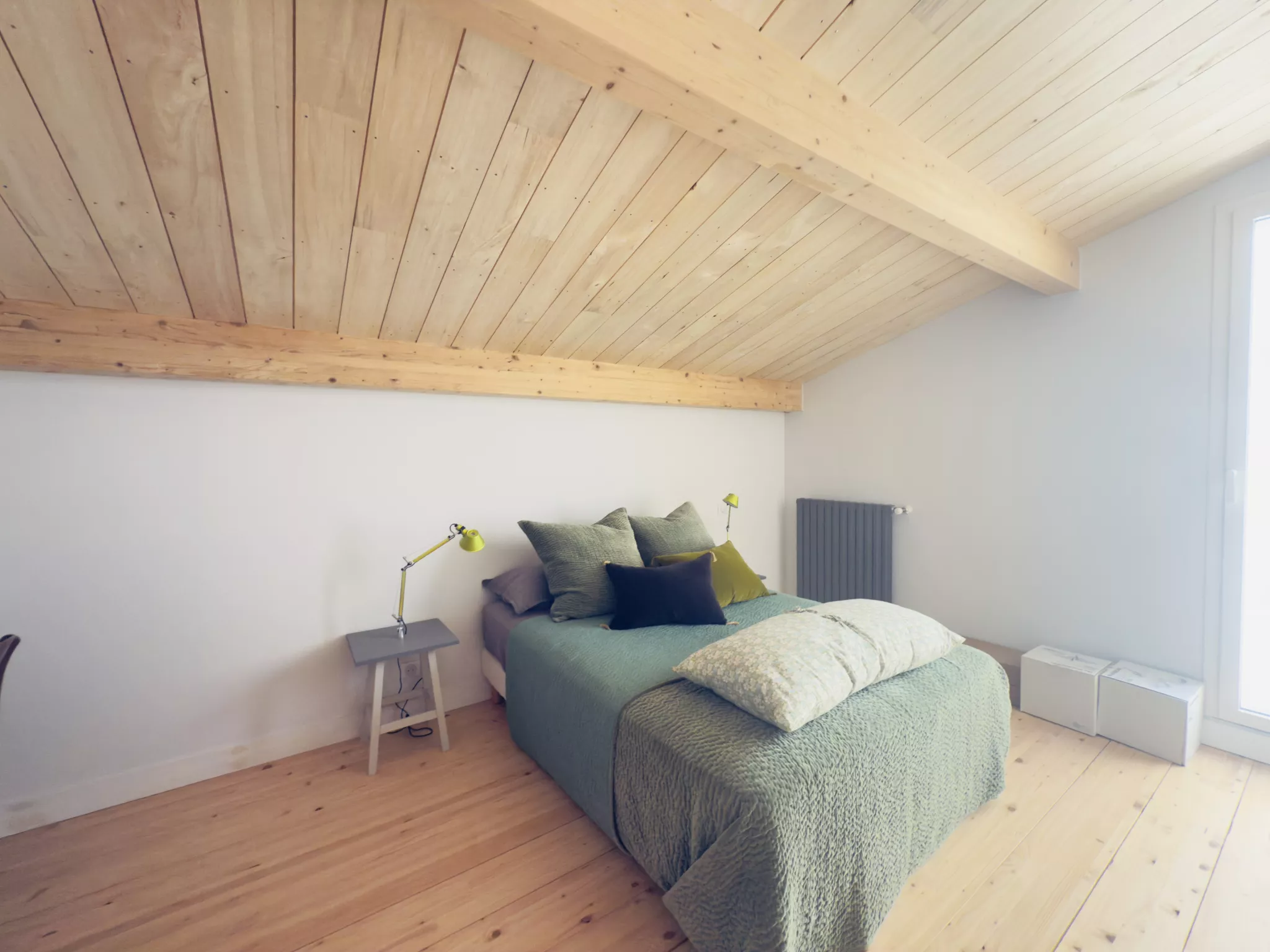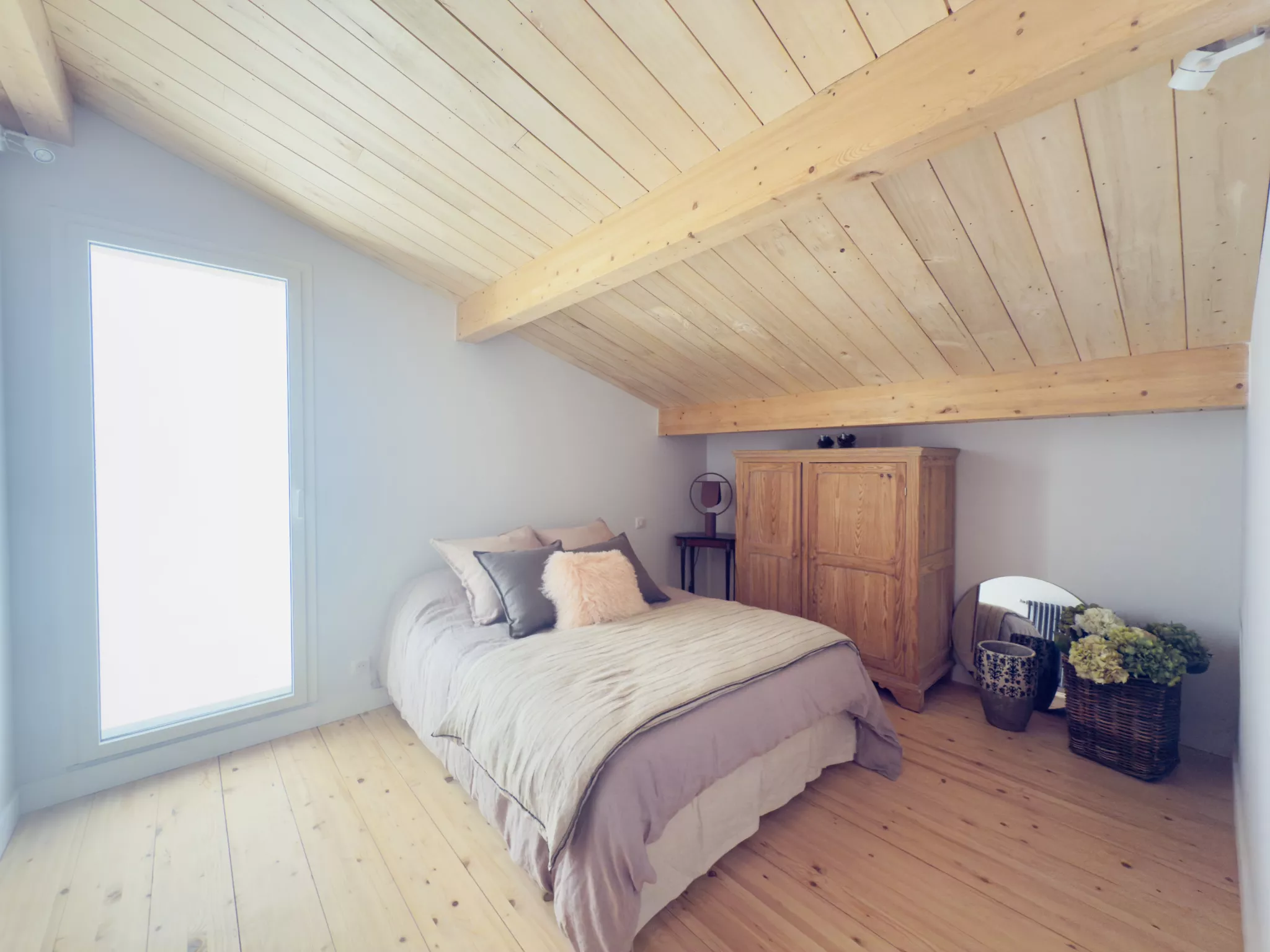 À l'étage, l'espace nuit propose deux chambres confortables de 15 m2 et 13,5 m2, un WC ainsi qu'une salle d'eau .