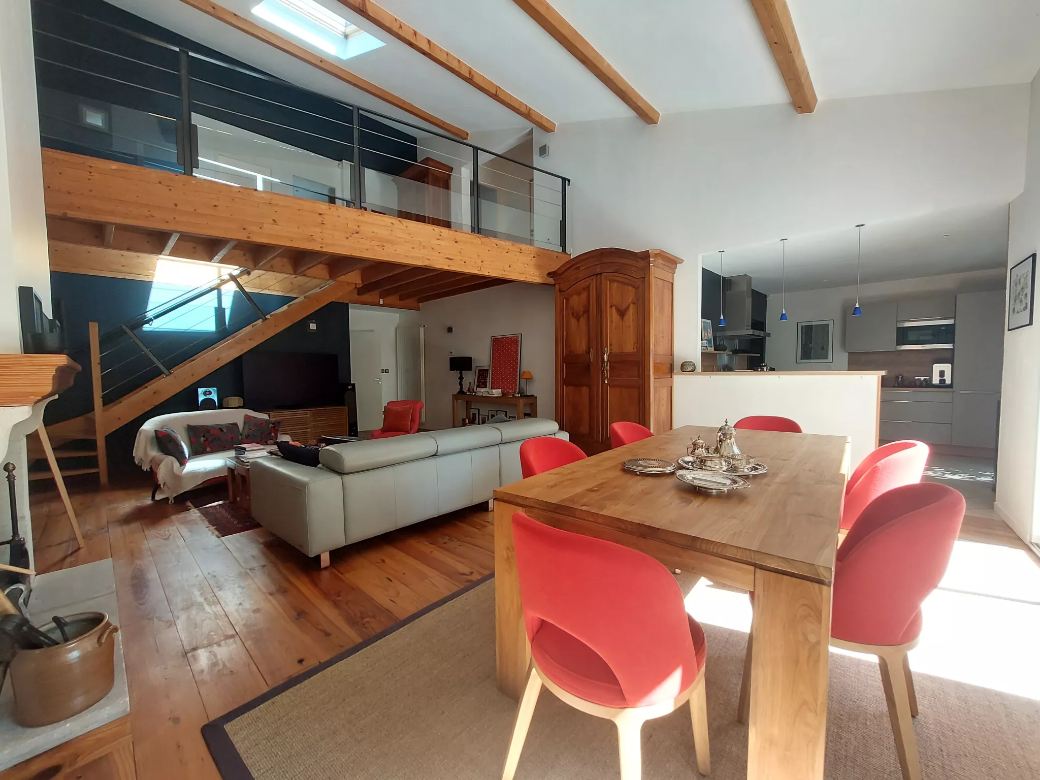 D'une surface habitable de 175 m2, cette demeure se distingue par la qualité de ses matériaux et son agencement optimisé. Le plancher massif confère chaleur et authenticité, tandis que la cheminée en pierre crée une atmosphère conviviale. Le séjour lumineux, sublimé par un plafond cathédrale, offre une magnifique sensation d'espace. Un bureau de 20 m2 en mezzanine surplombe cette pièce de vie, constituant un espace de travail confortable et inspirant.