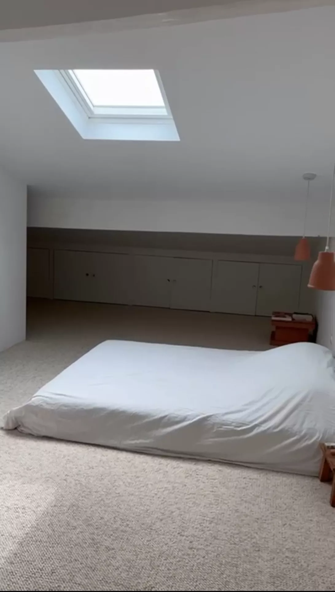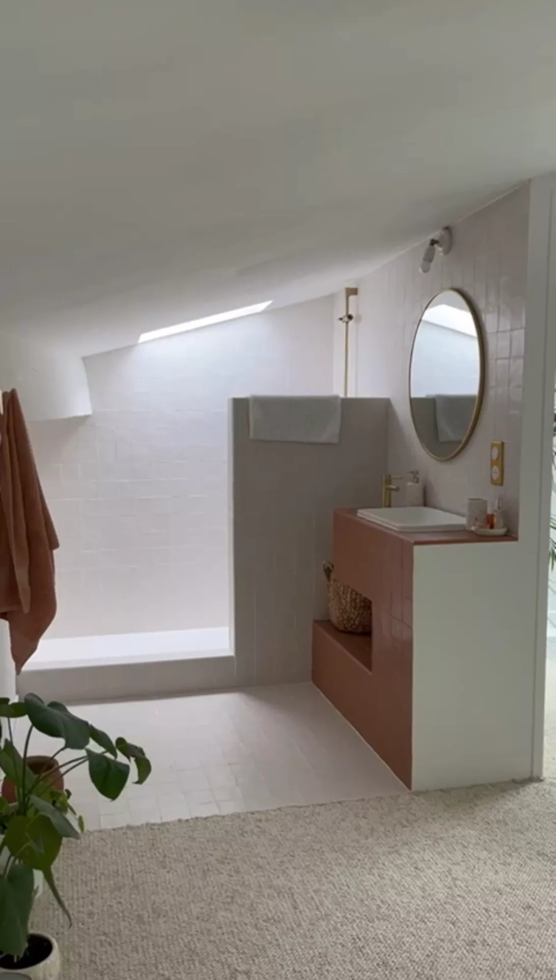 En dernier niveau, une suite sous combles forme un refuge paisible : charpente apparente, teintes naturelles, salle d'eau raffinée et rangements sur mesure créent une atmosphère chaleureuse, à l'abri des regards.