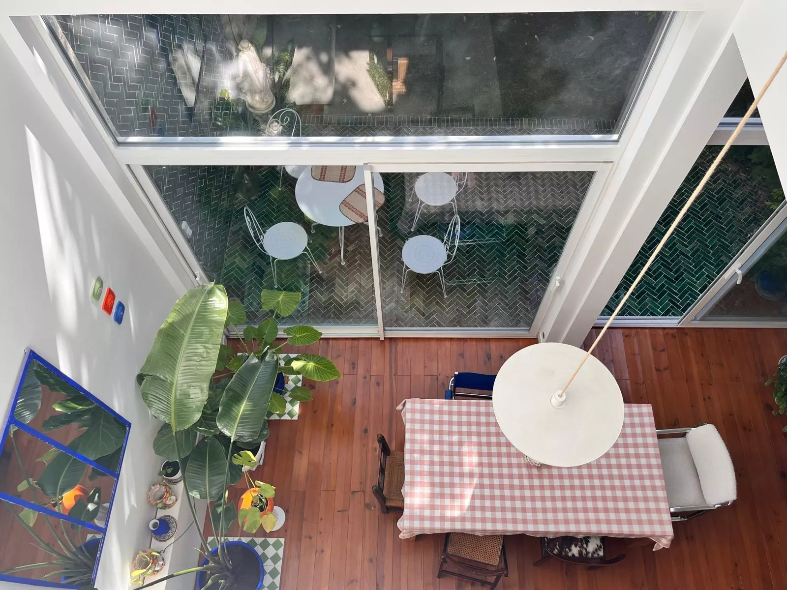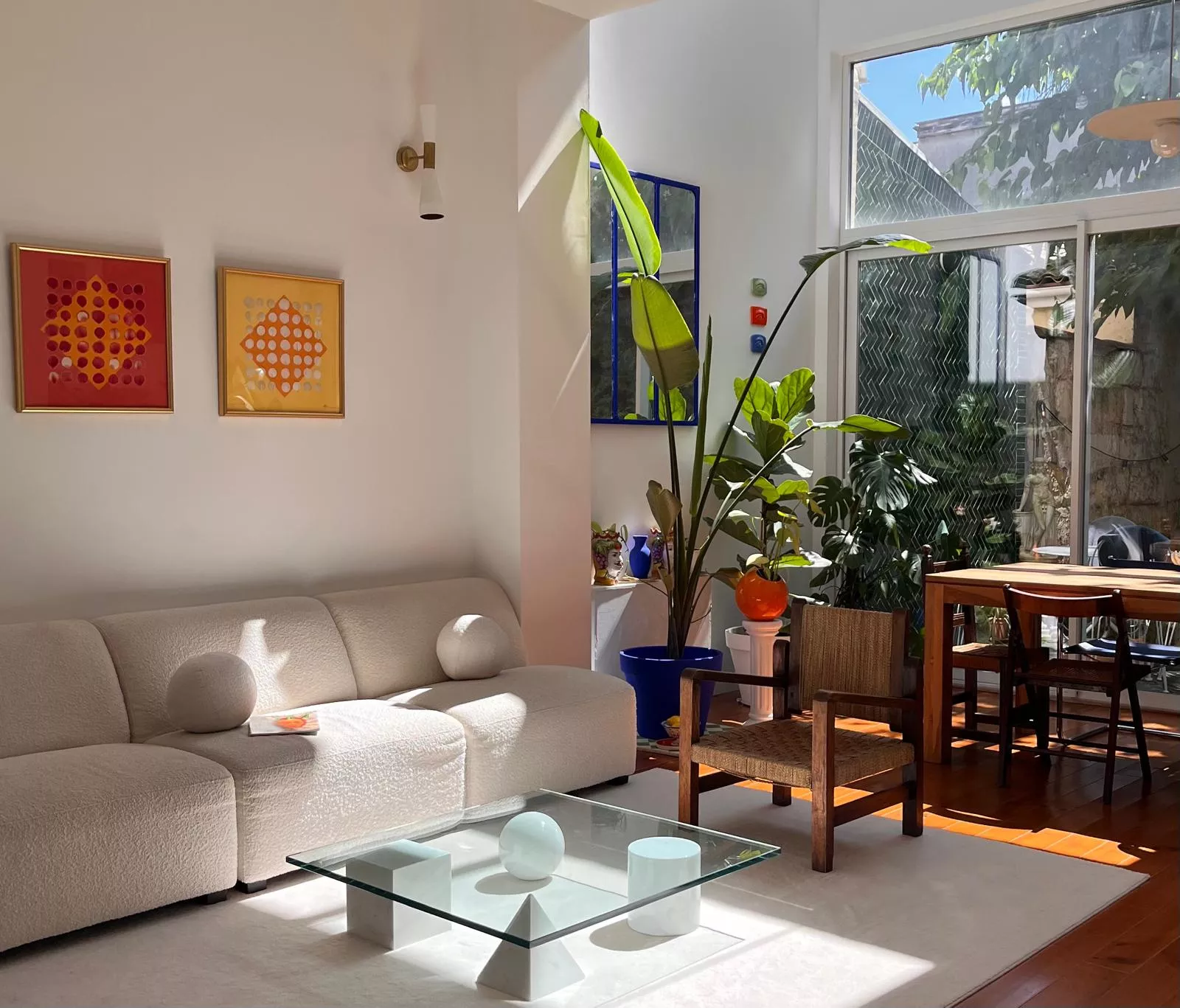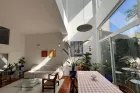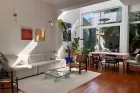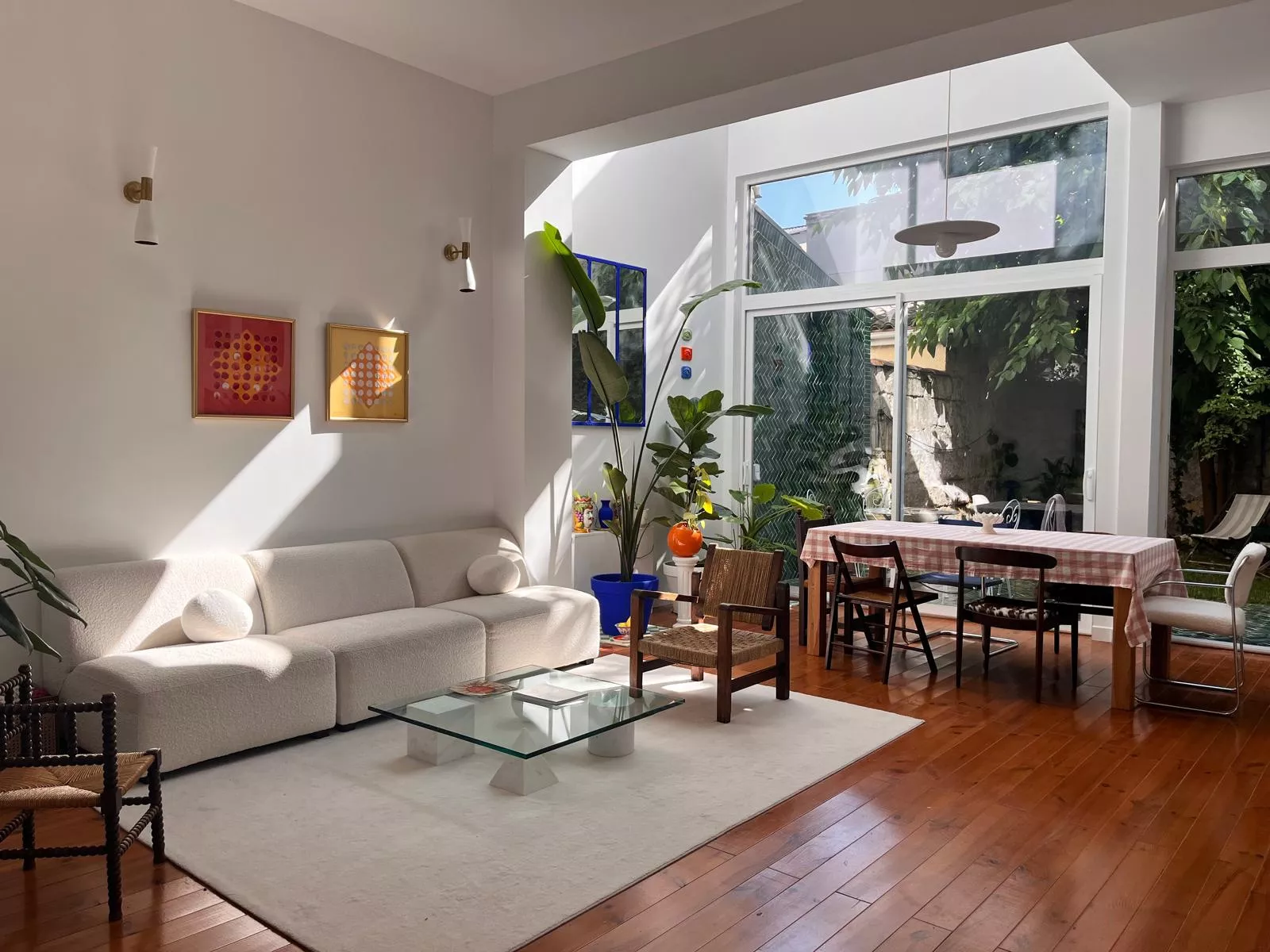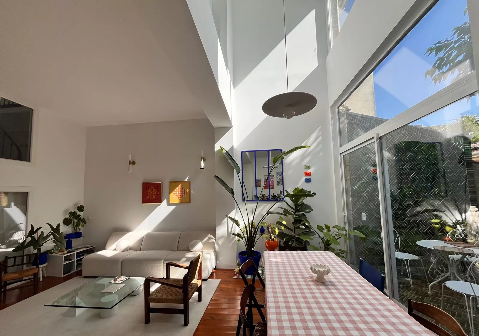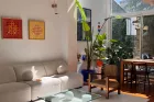 La vaste pièce de vie s'organise autour d'une cuisine discrètement intégrée et d'annexes fonctionnelles. De larges ouvertures prolongent naturellement le séjour vers un jardin intime, végétalisé, qui devient une pièce à vivre supplémentaire aux beaux jours.