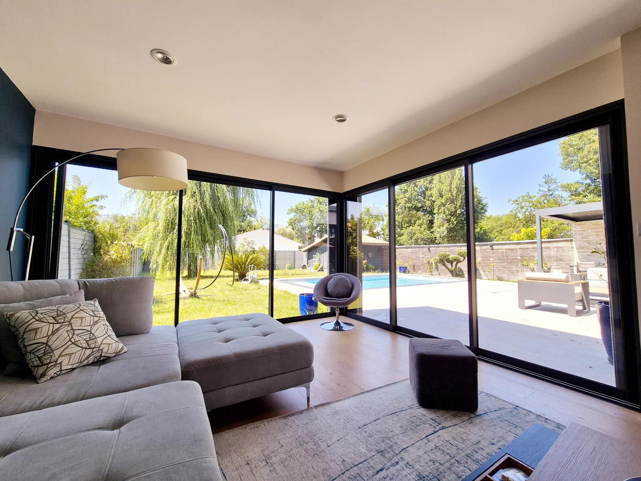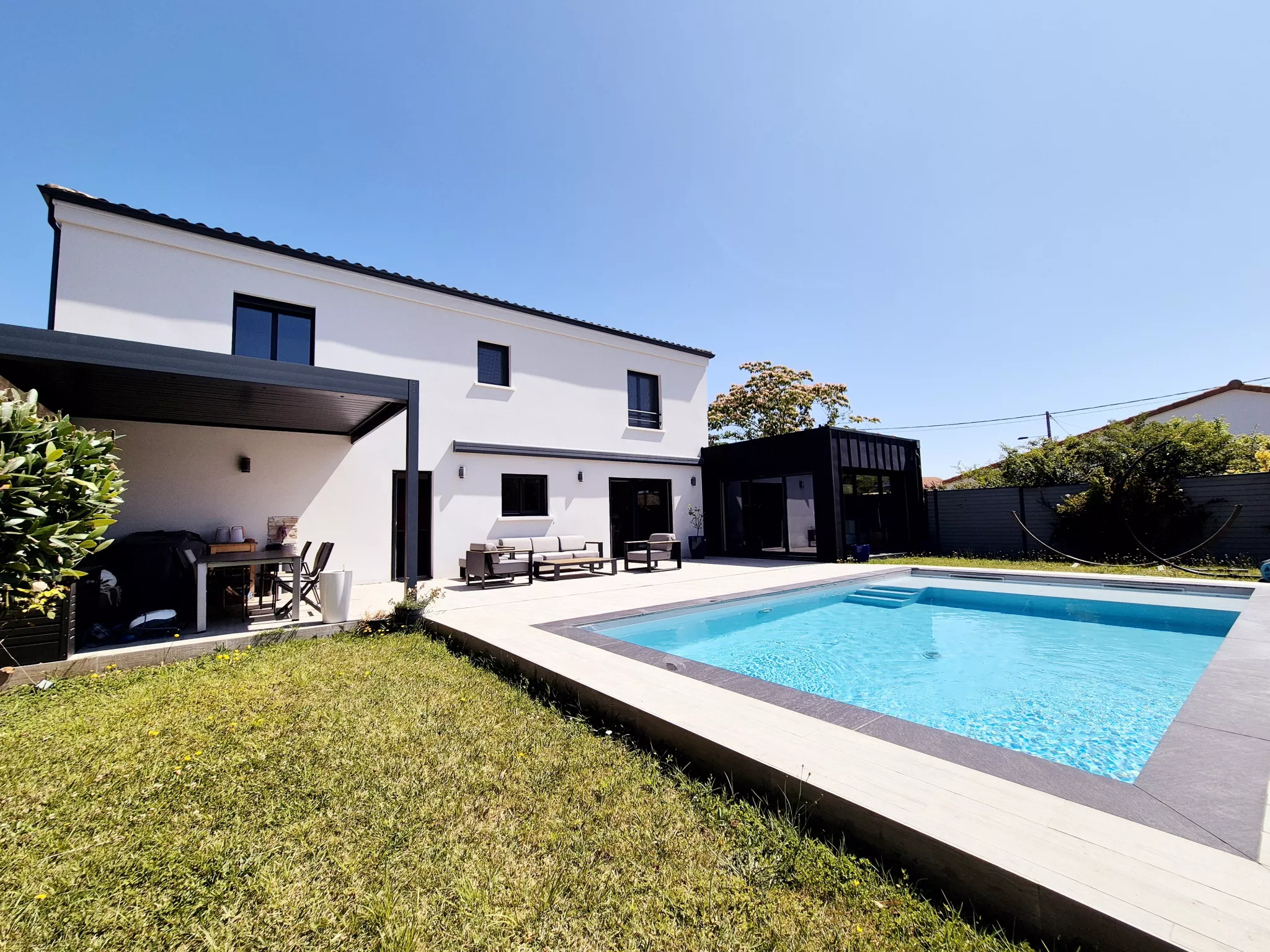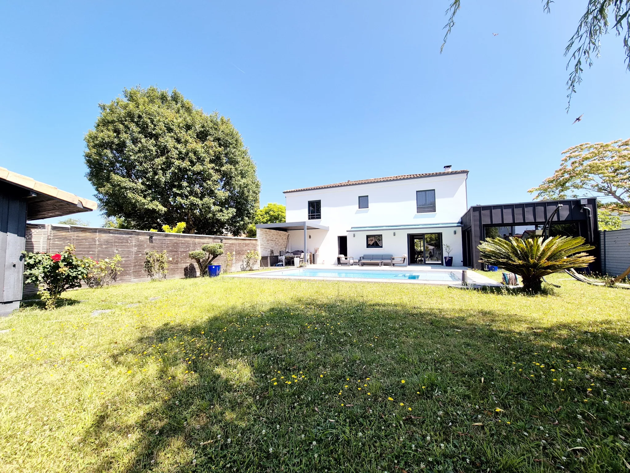 À l'extérieur, le terrain de 800 m2, sans aucun vis-à-vis, dévoile un superbe espace aménagé avec une grande terrasse et une piscine, idéal pour se détendre et profiter pleinement des beaux jours dans un cadre intime et privilégié.