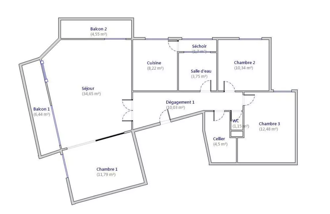 La pièce de vie s'ouvre sur deux balcons, offrant un quotidien dedans-dehors très agréable. La cuisine, attenante à un séchoir et à un cellier, optimise l'organisation de l'espace. Possibilité d'agrandir le séjour en réunissant la troisième chambre pour créer un vaste espace traversant et ultra lumineux d'environ 46 m2. L'espace nuit comprend alors deux chambres, une salle d'eau et un cellier.
