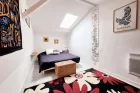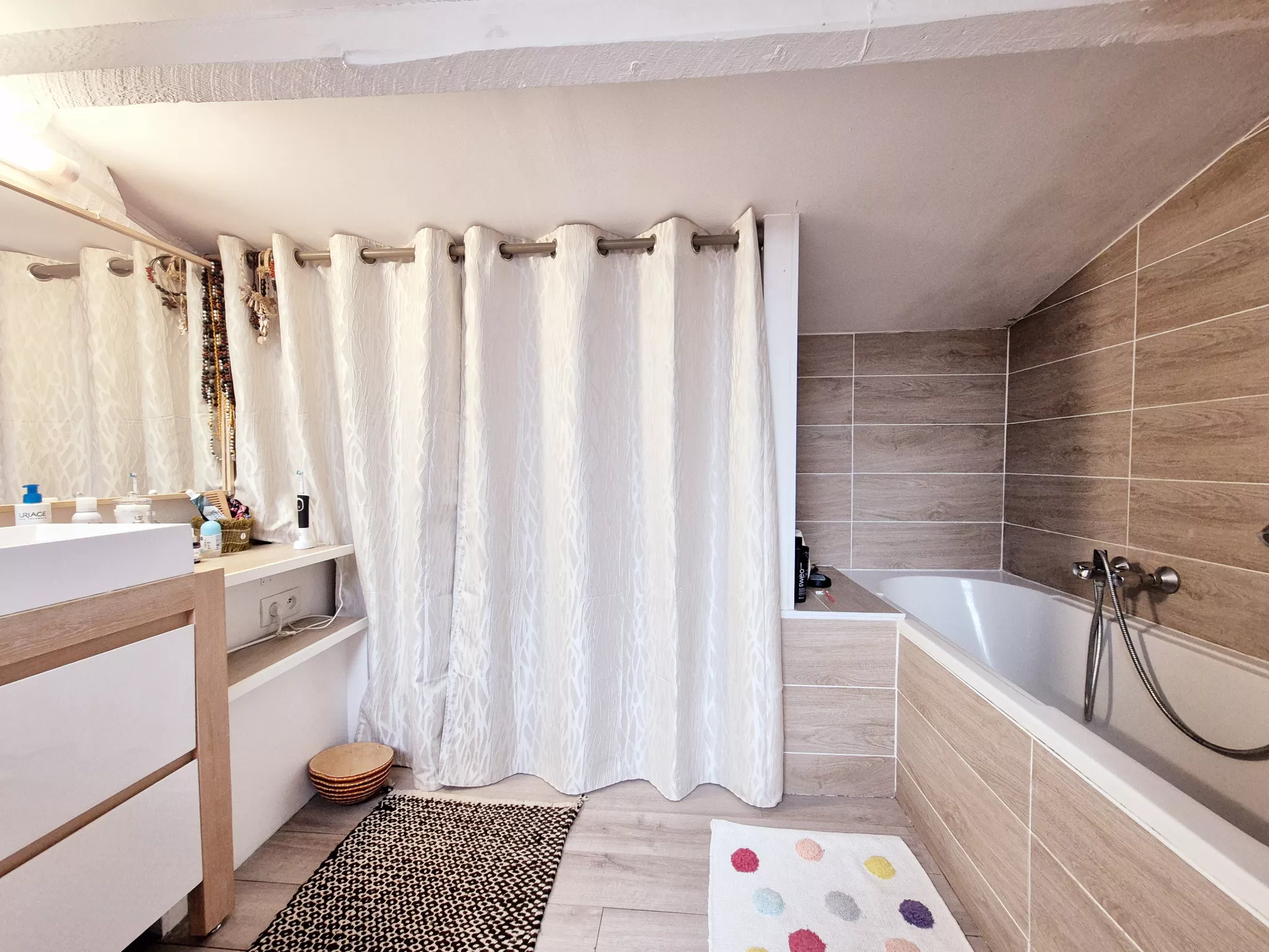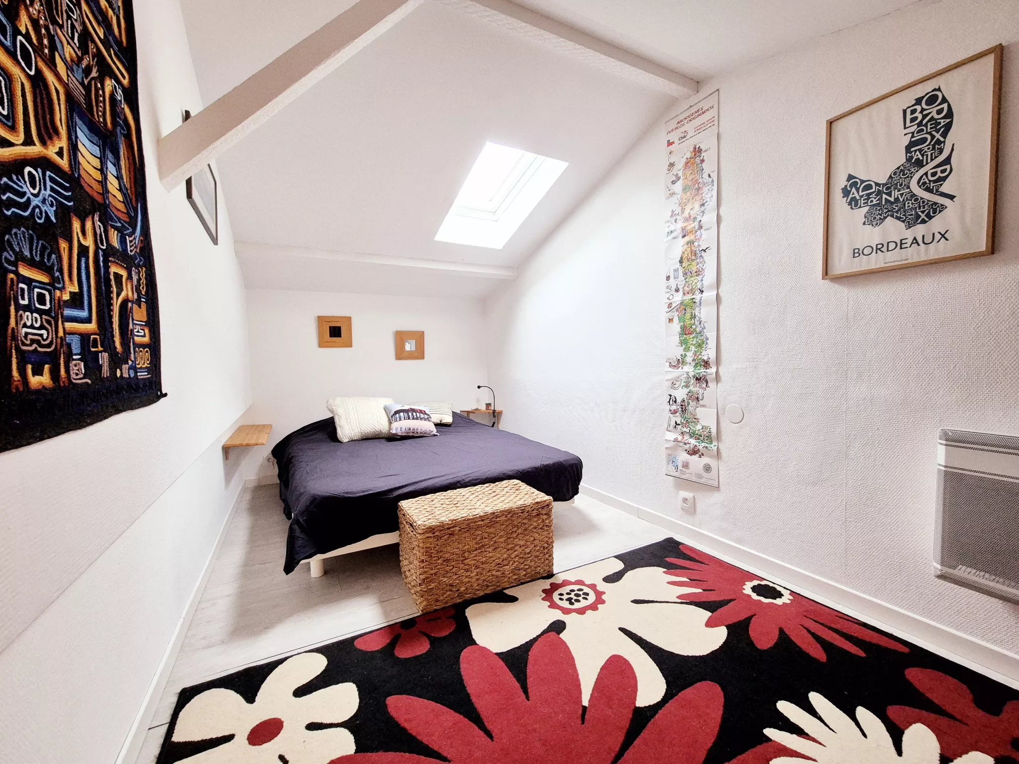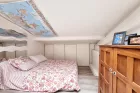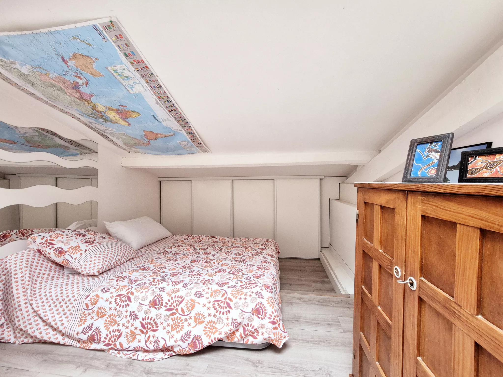Un premier escalier dessert une chambre spacieuse nichée sous les toits, un second escalier amène à un bel espace regroupant une chambre, une espace de rangement et une salle de bain.