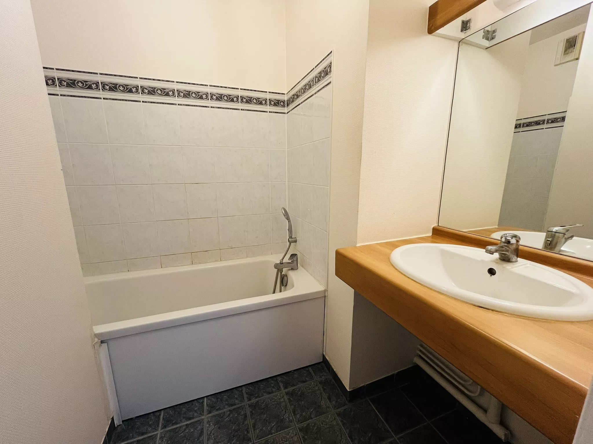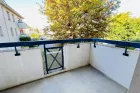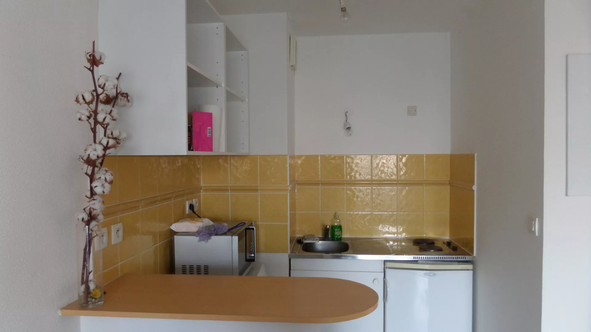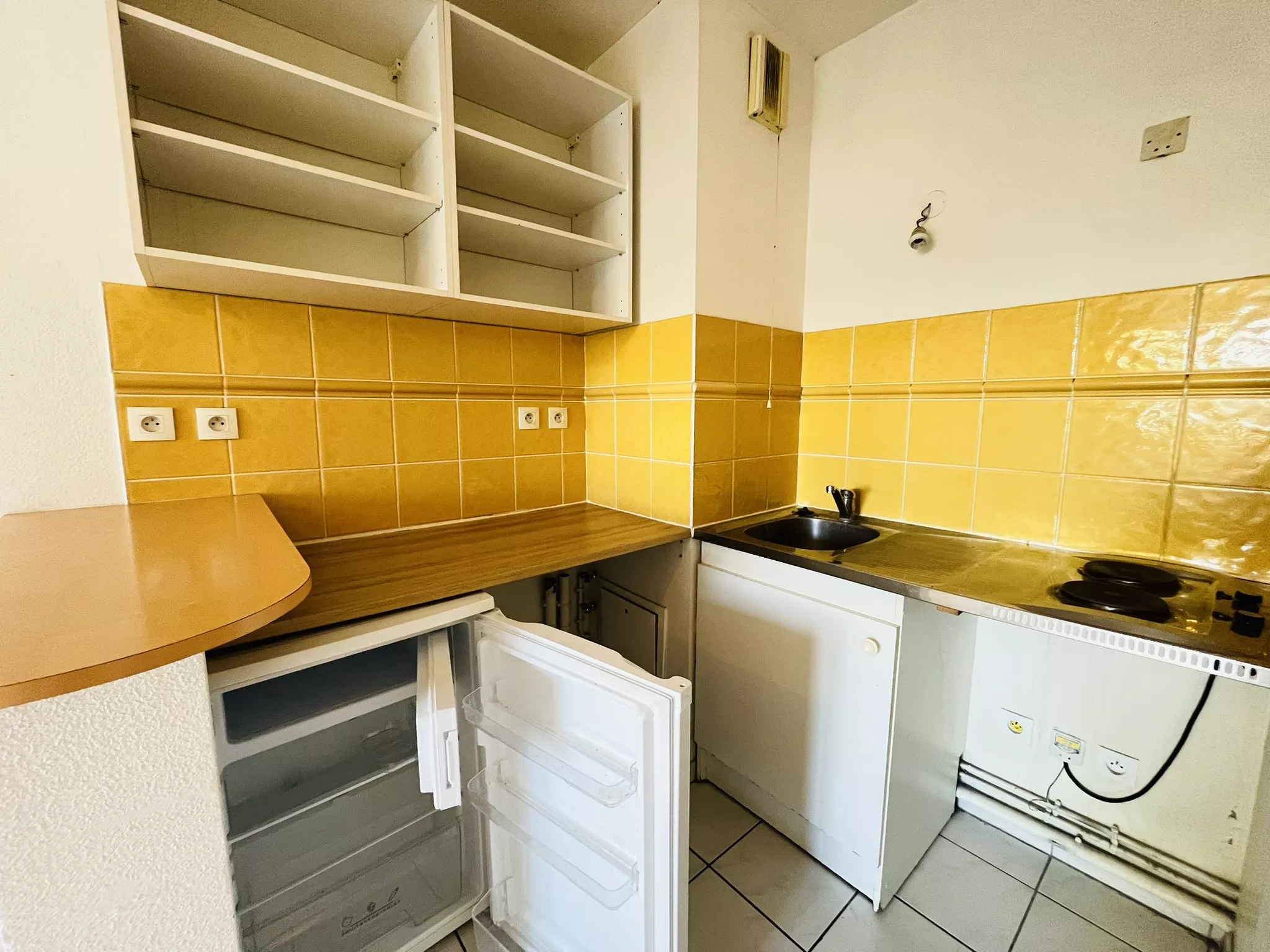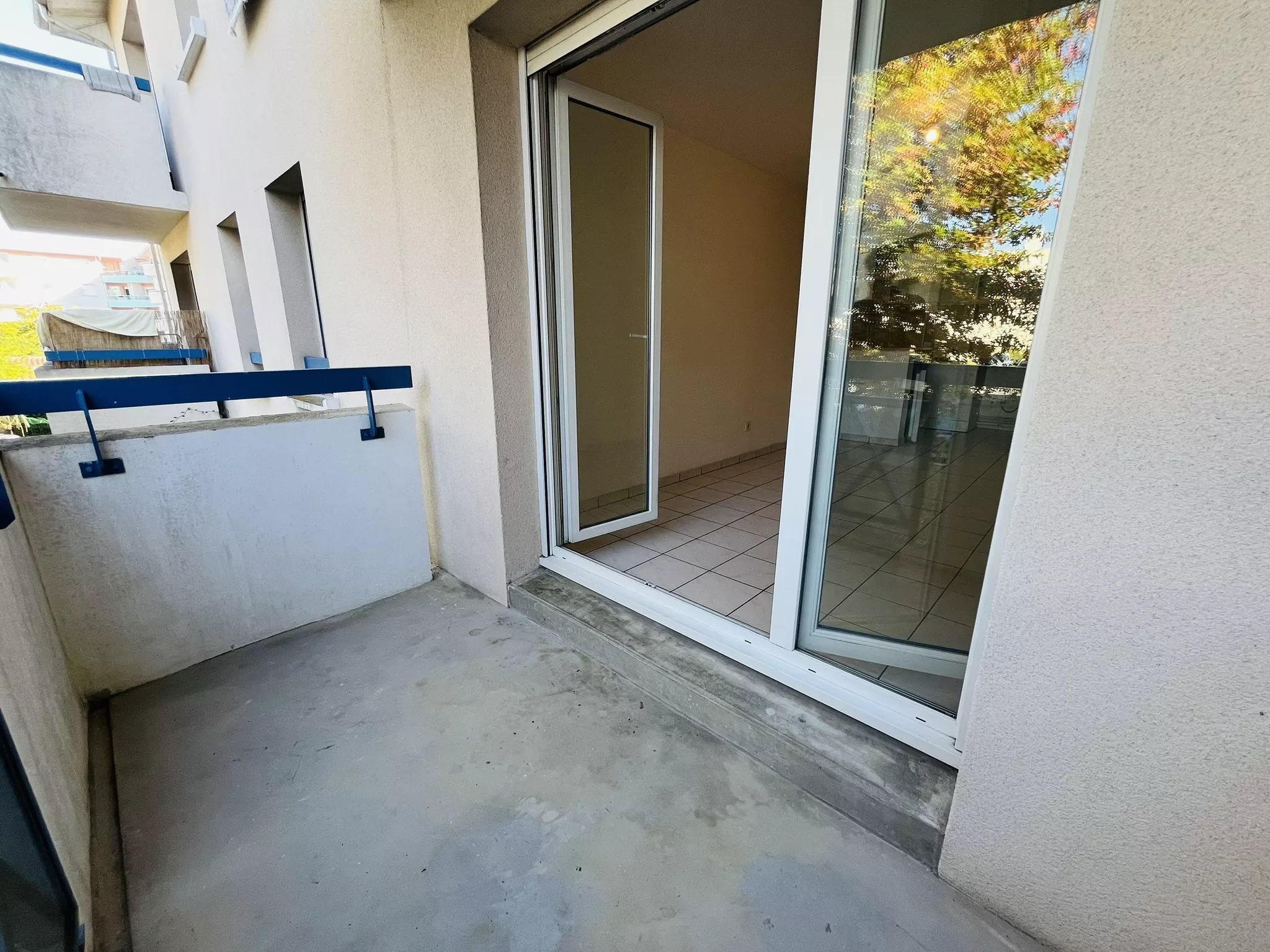 L'appartement comprend un séjour lumineux avec cuisine ouverte, donnant sur un balcon calme. La chambre dispose d'un placard intégré et la salle de bains est accompagnée de WC indépendants.