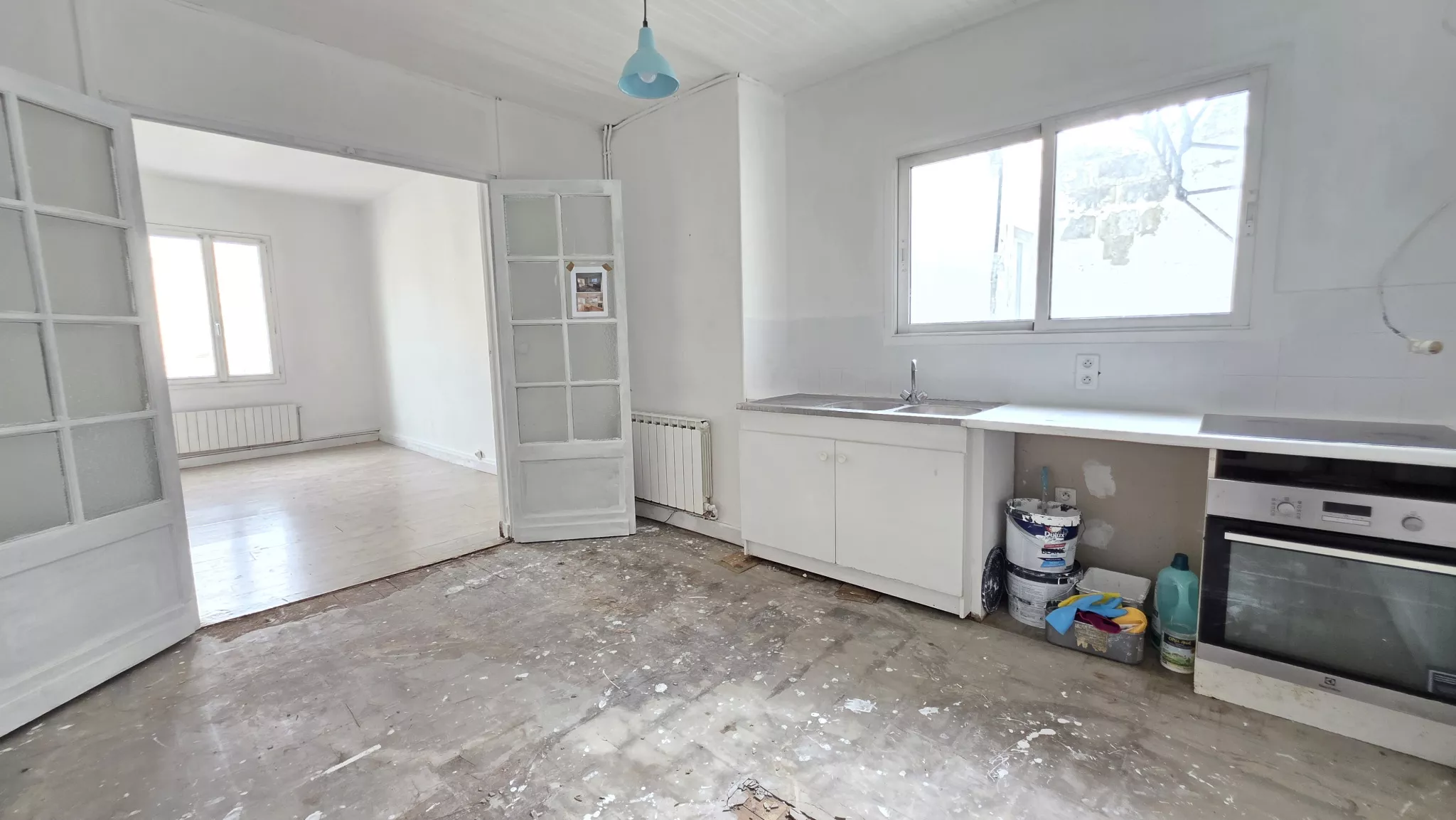 Un vaste séjour double baigné de lumière avec cuisine américaine ouverte.