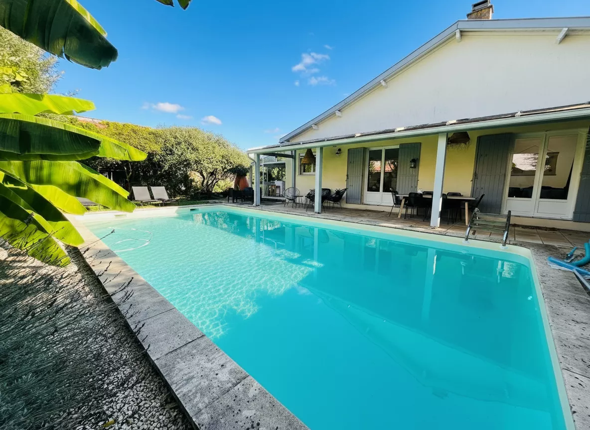 La maison, de plain-pied et en parfait état, ne nécessite aucun travaux. Elle se compose d'un salon lumineux avec cheminée, ouvert sur le jardin avec piscine, d'une cuisine aménagée dans une véranda, très agréable et baignée de lumière, ainsi que de trois chambres, d'une grande salle d'eau et d'une buanderie fonctionnelle.