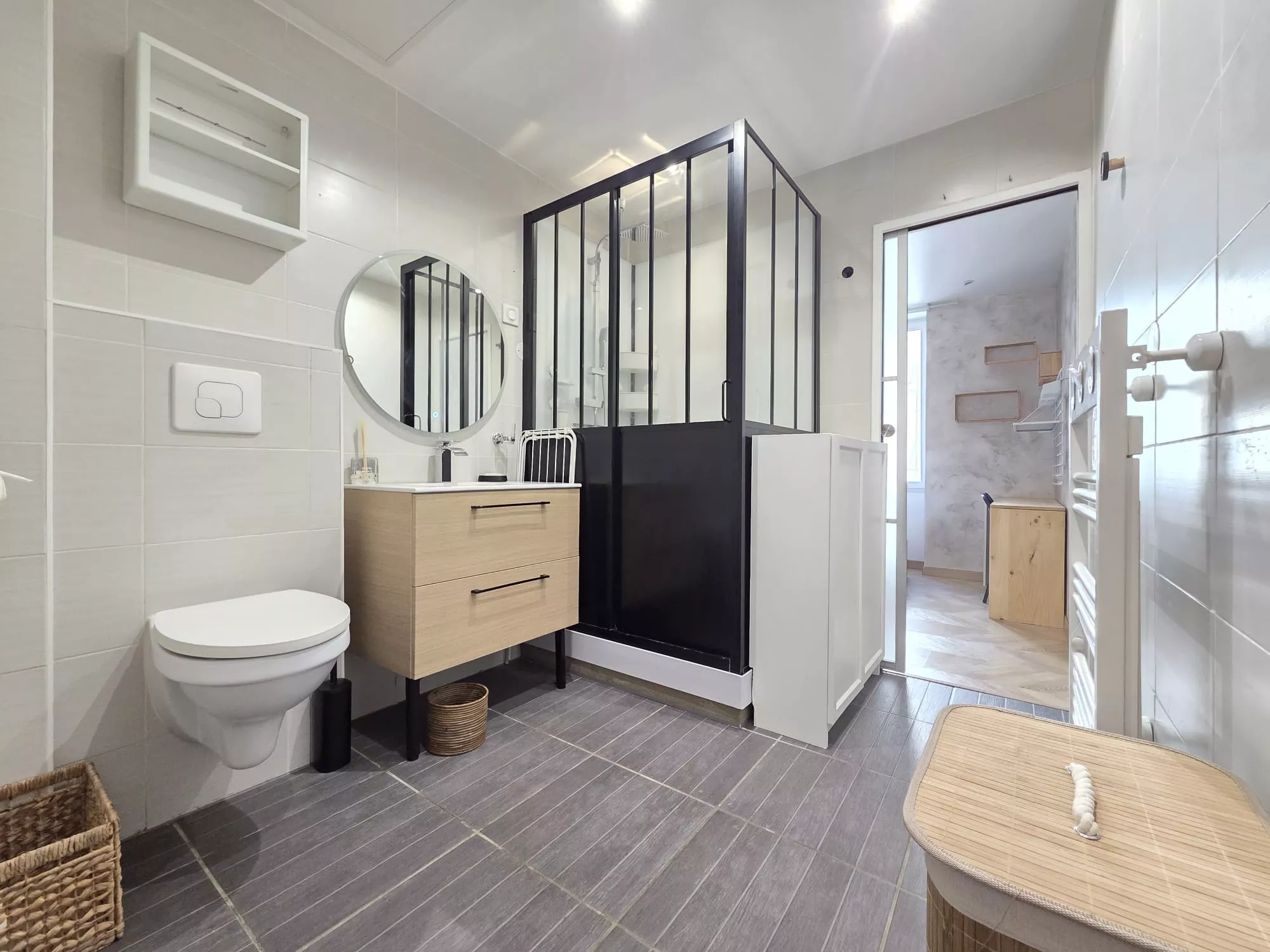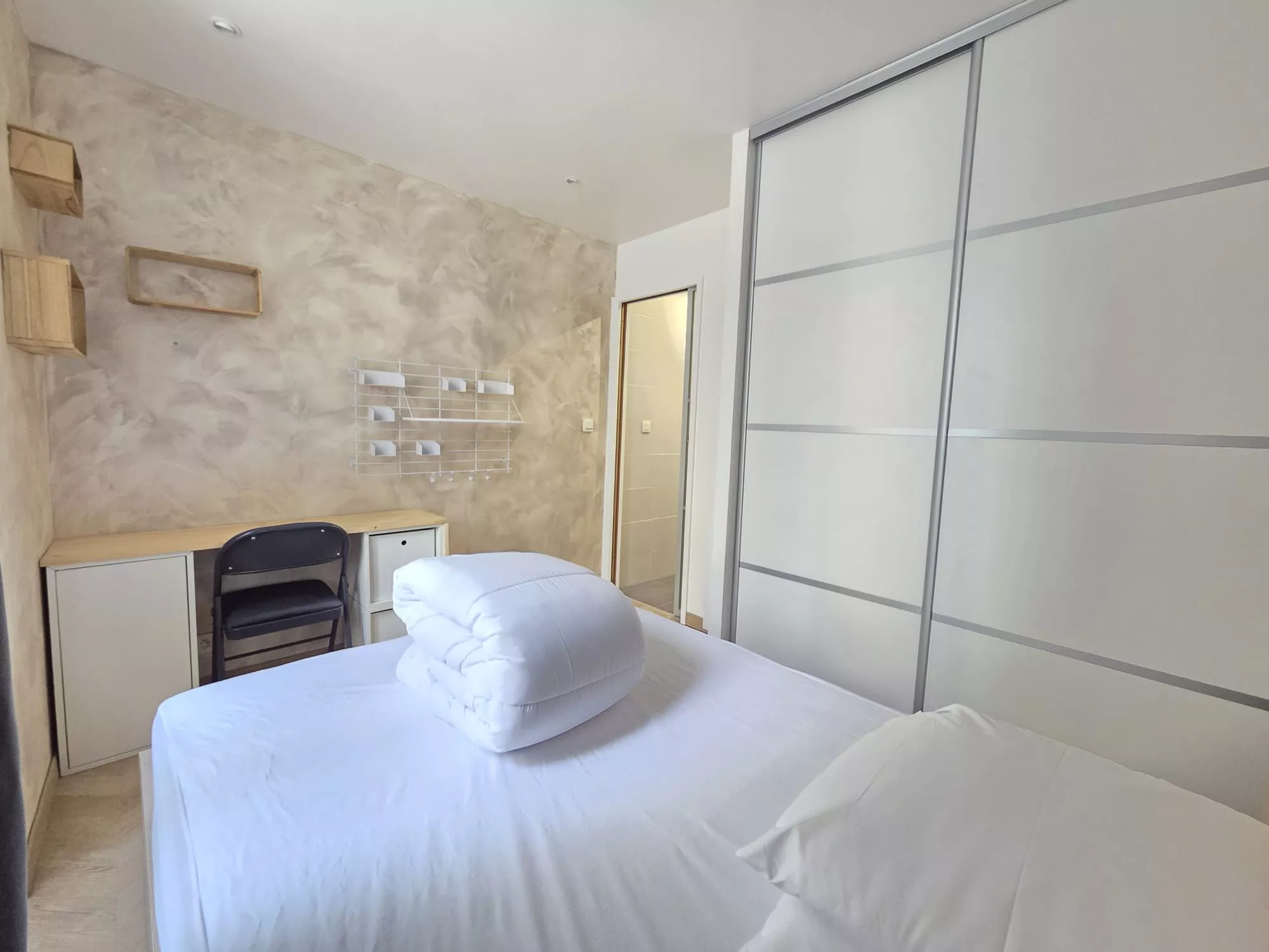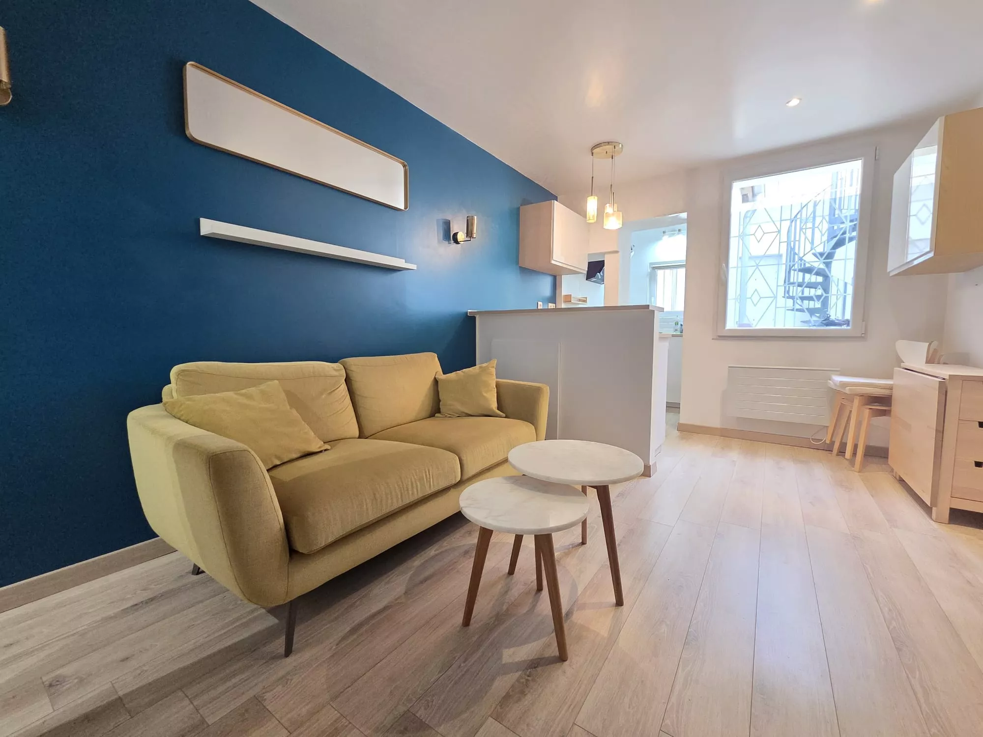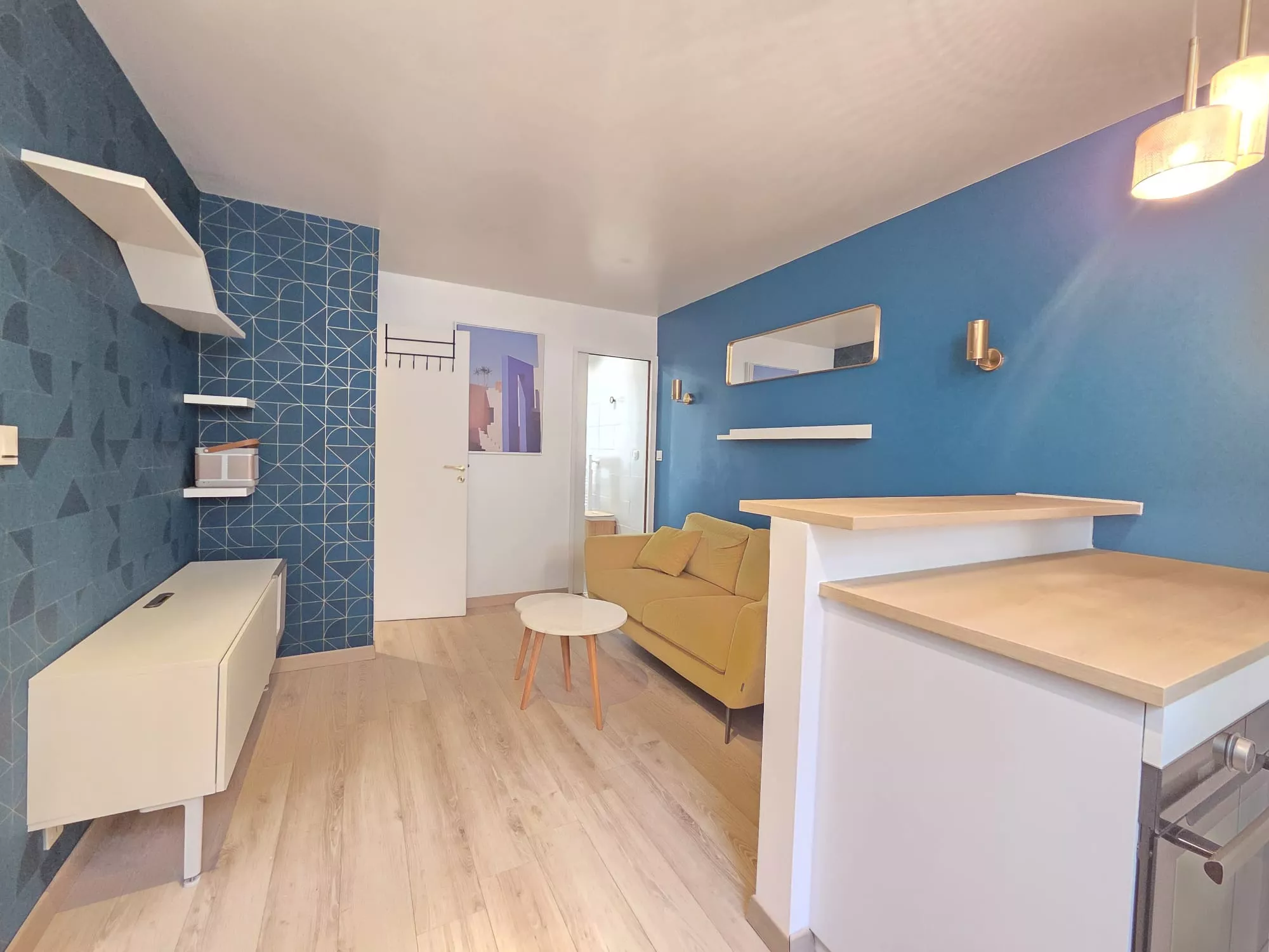 Il se compose d'un séjour, d'une cuisine équipée donnant sur la cour intérieure de l'immeuble, d'une salle d'eau avec WC, ainsi que d'une chambre avec rangements