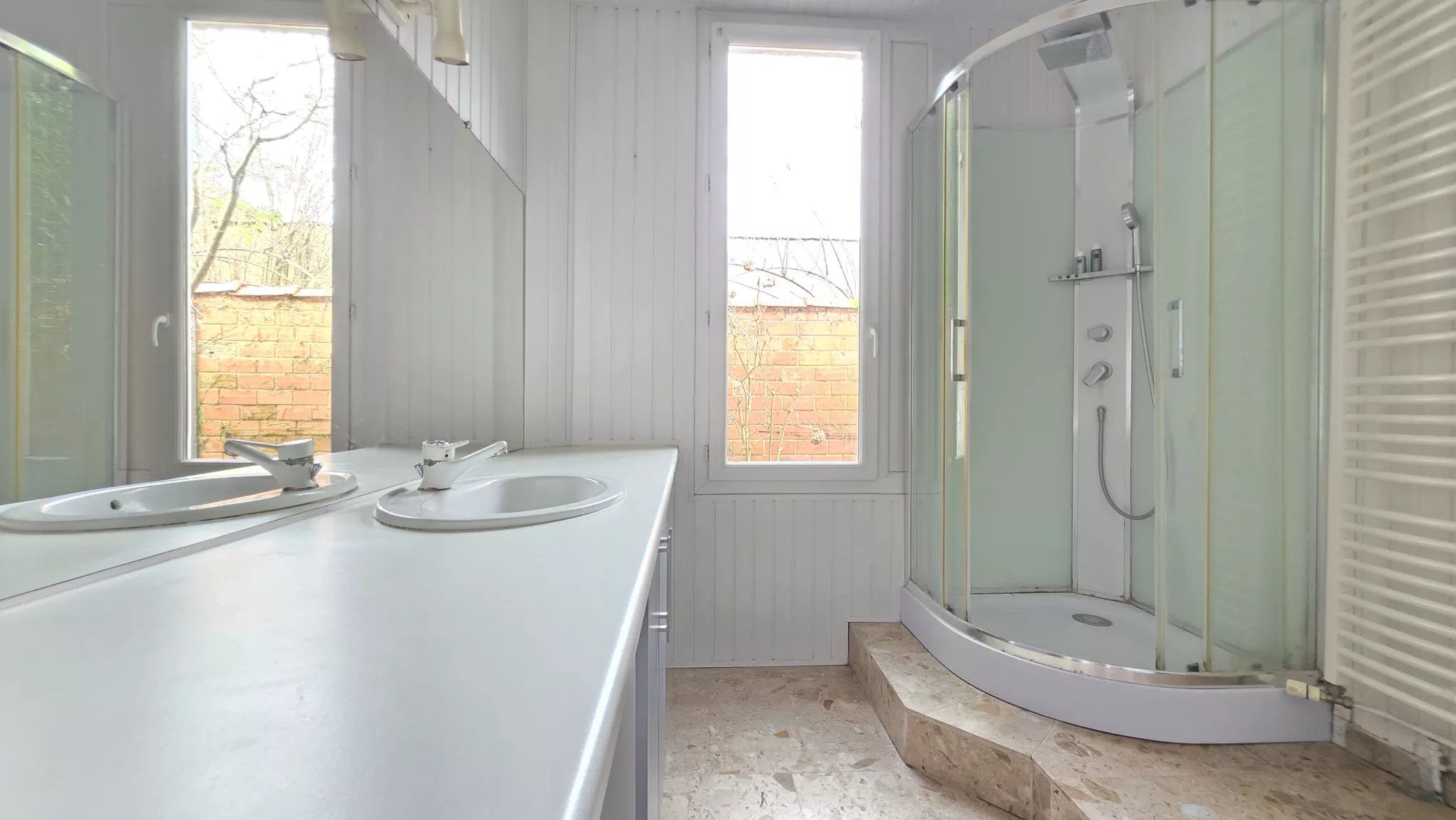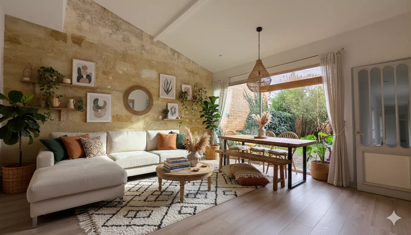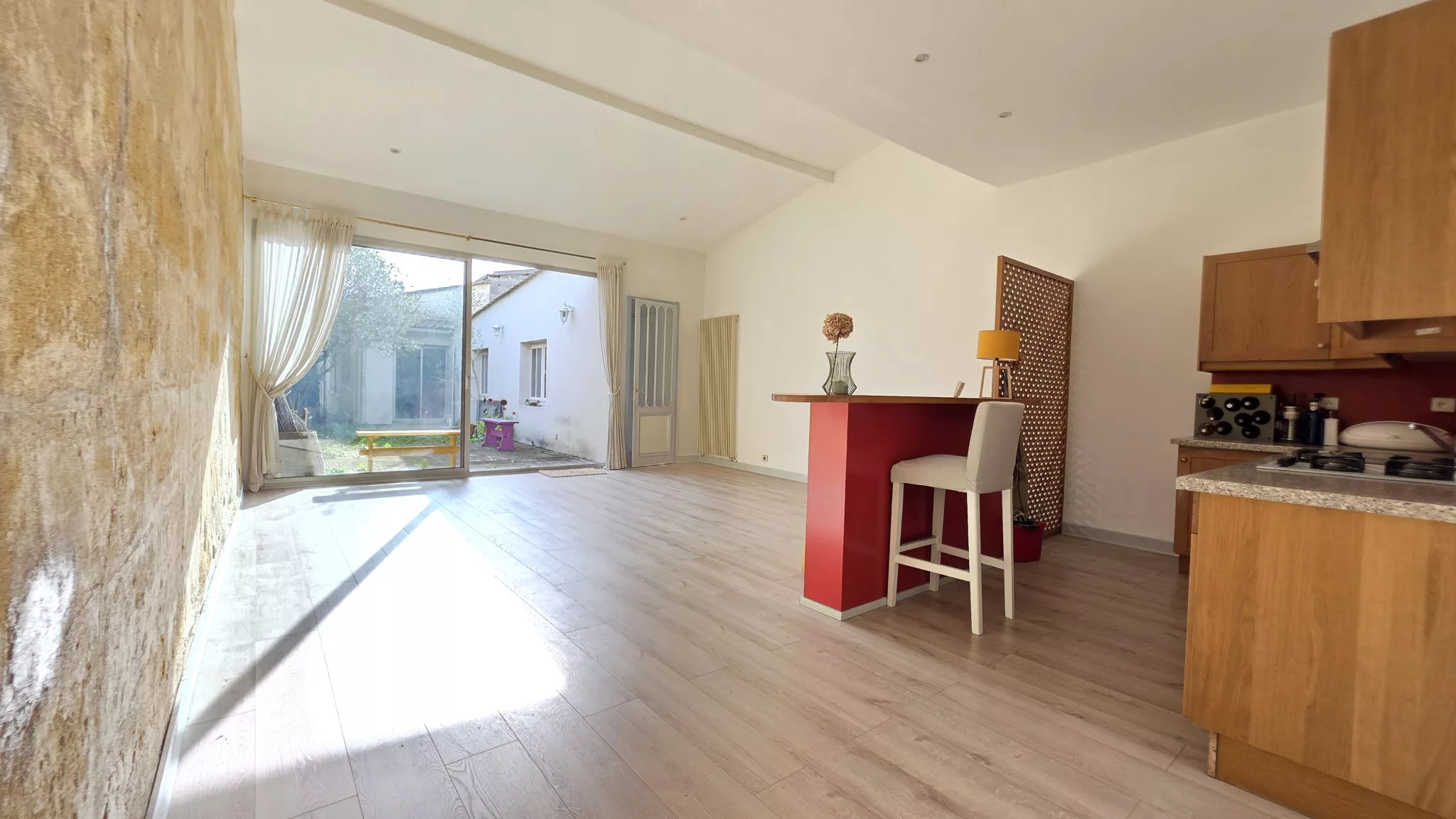 La maison offre une vaste pièce de vie composée d'un séjour et d'un salon lumineux, ouverte sur le jardin et prolongée par une cuisine américaine et conviviale.