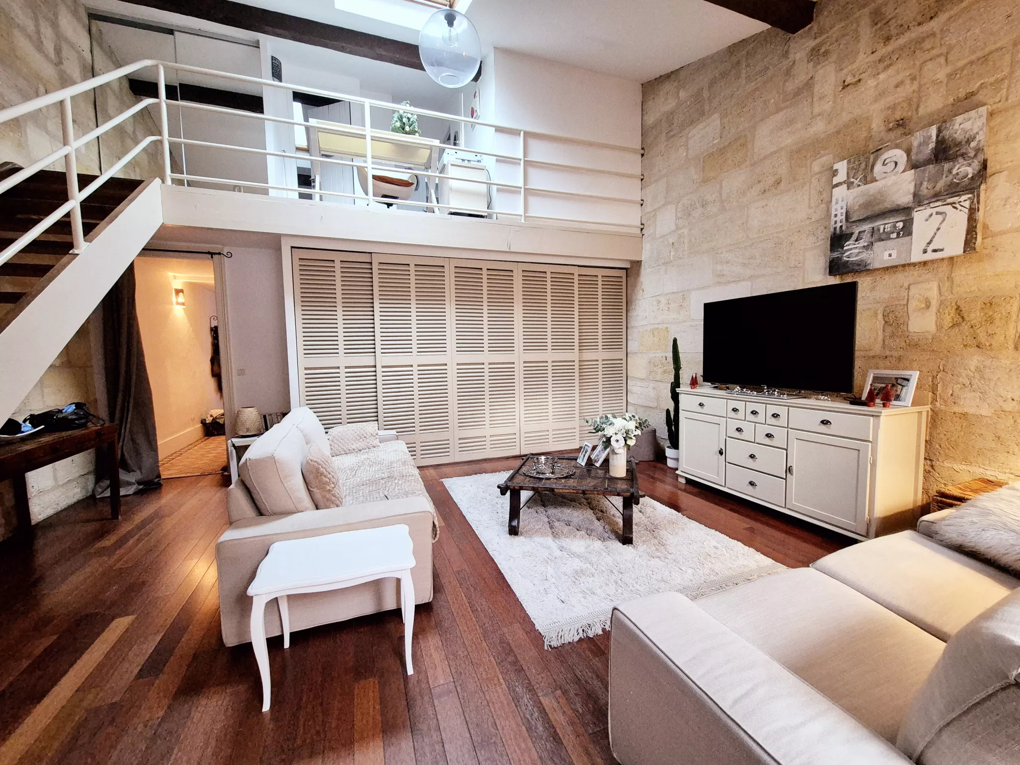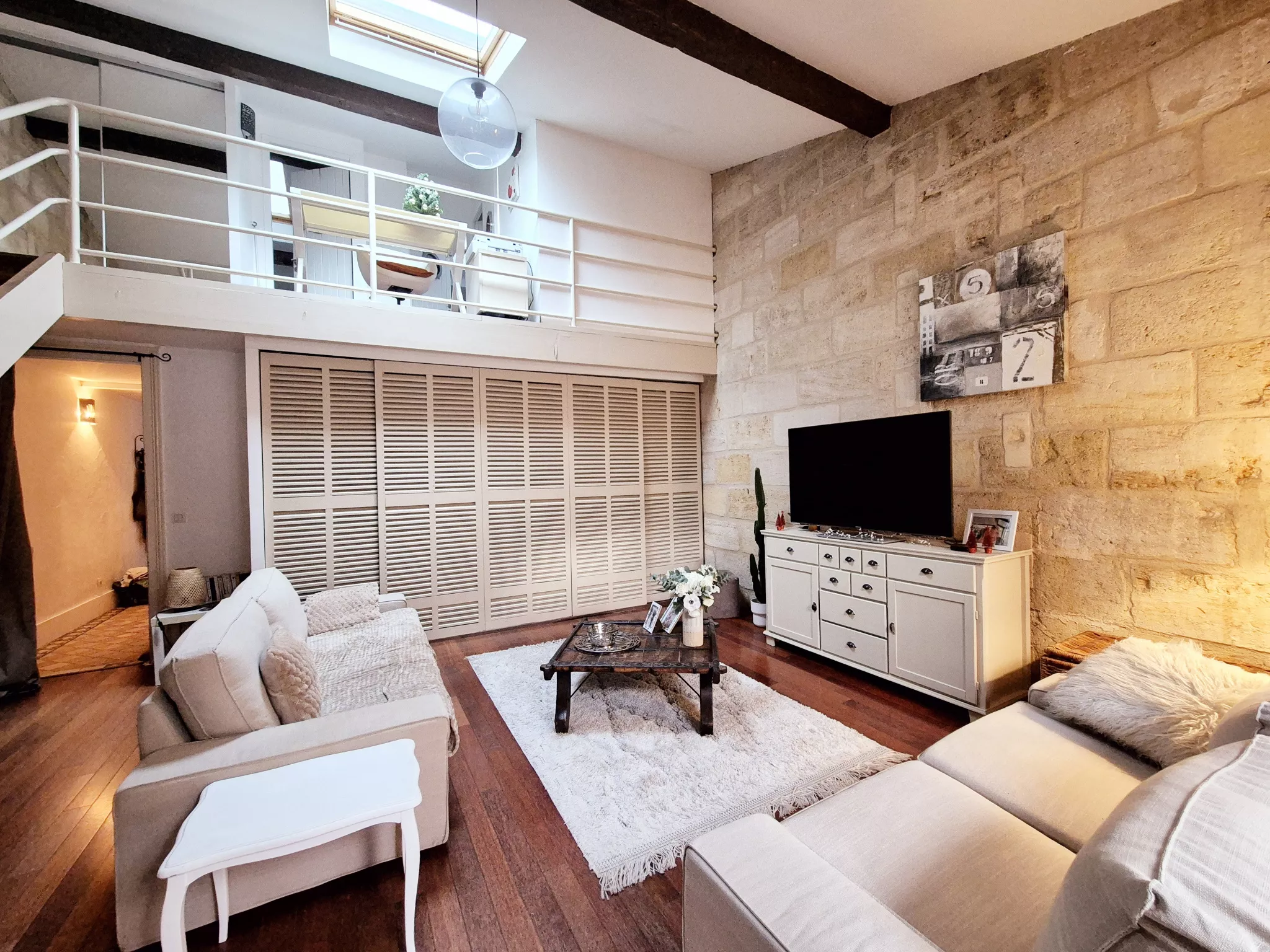 L'étage accueille un espace bureau en mezzanine, deux chambres supplémentaires et une seconde salle d'eau avec WC.