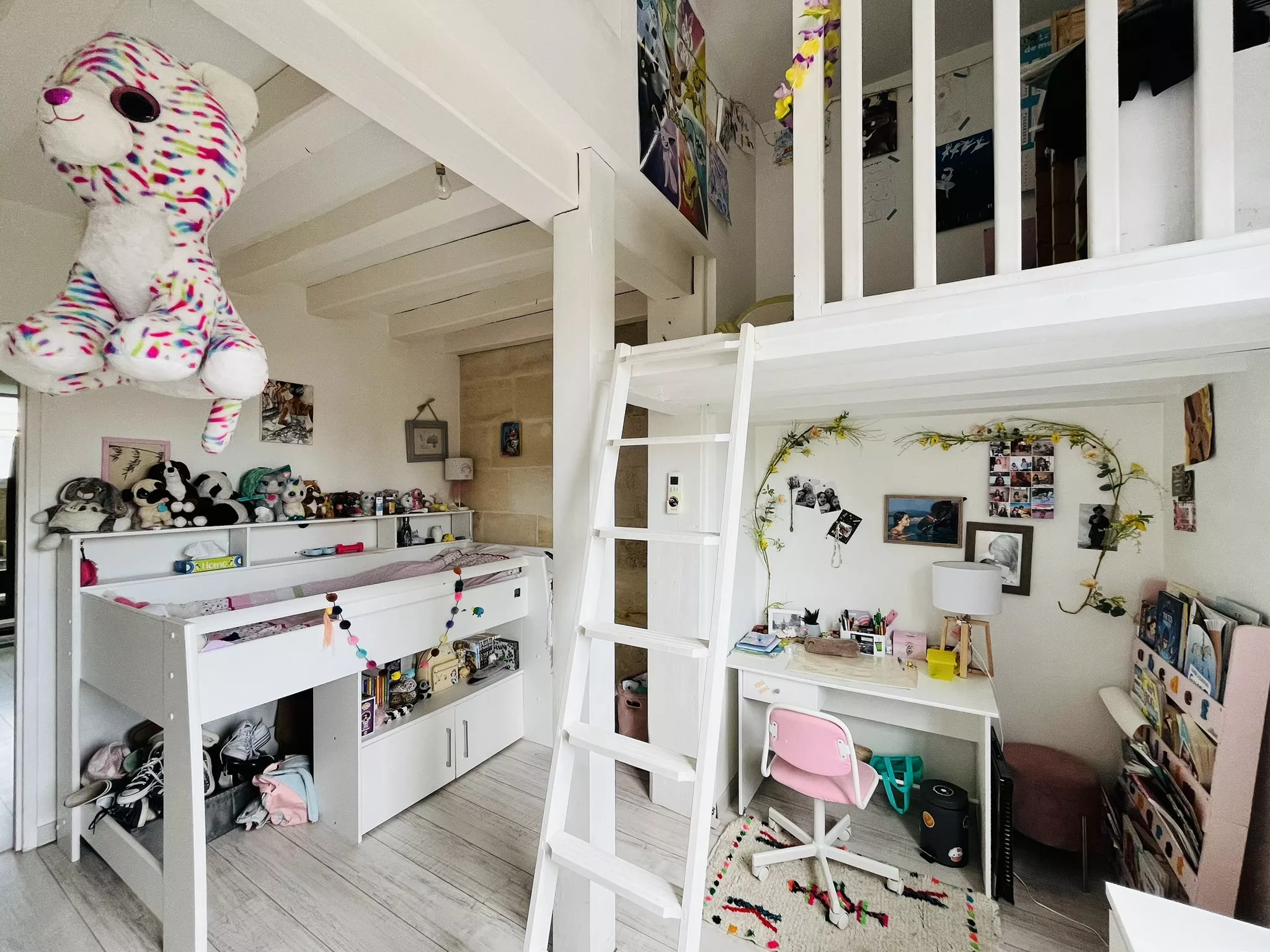 À l'étage, un large palier distribue trois chambres lumineuses, une salle d'eau et des toilettes. Deux d'entre elles disposent de mezzanines, parfaites pour aménager des espaces complémentaires de couchage, de jeux ou de rangement.