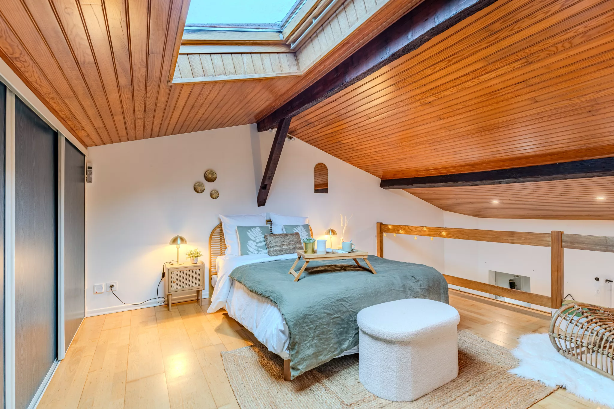 À l'étage, une belle chambre aux volumes généreux permet une configuration modulable, avec la possibilité de créer un espace bureau distinct tout en conservant un espace nuit confortable.