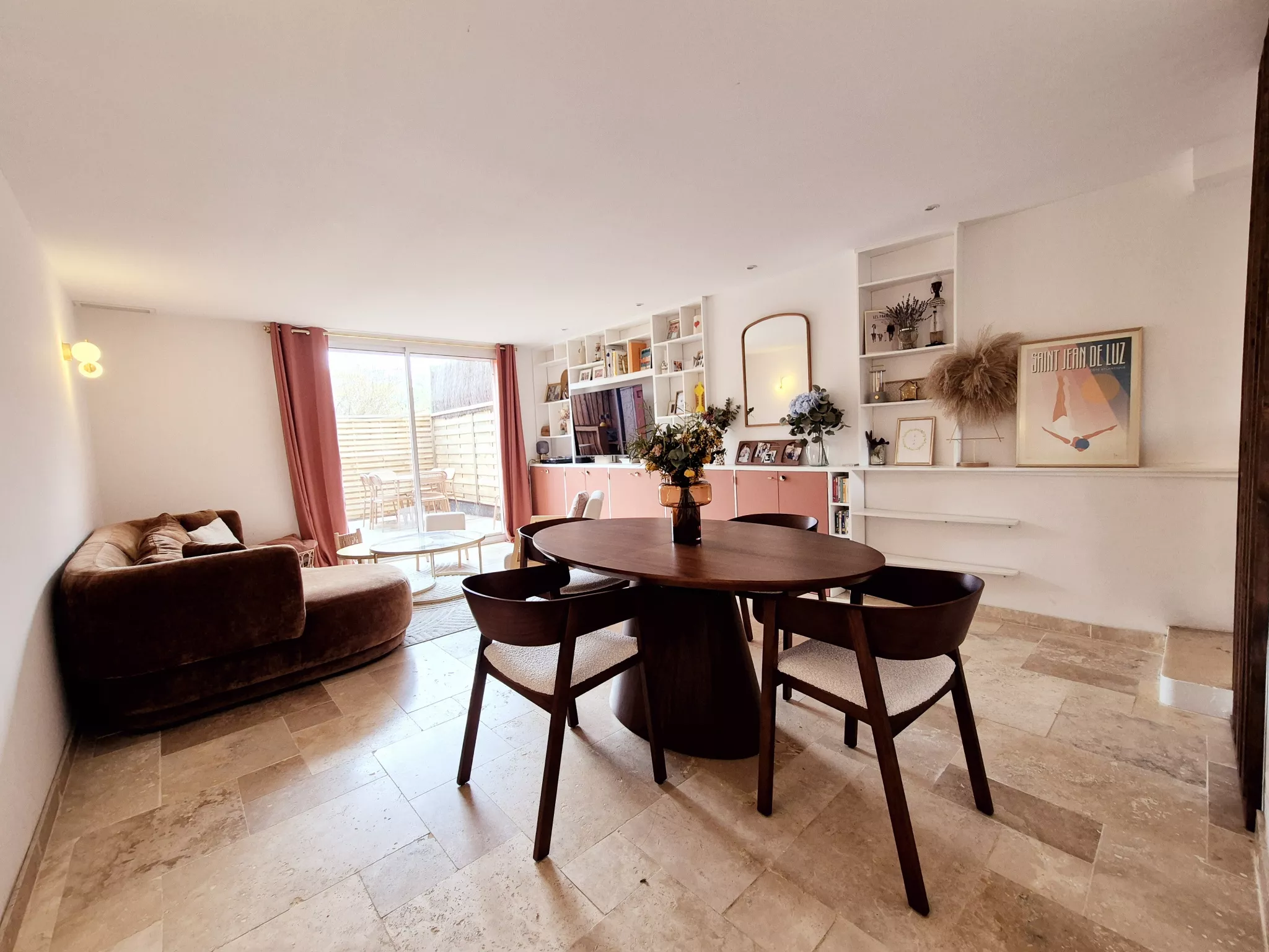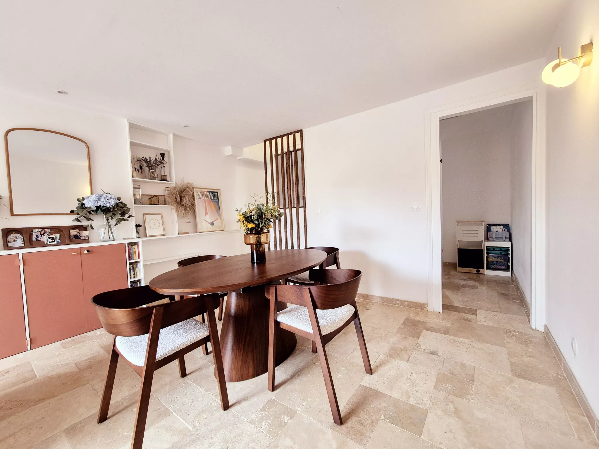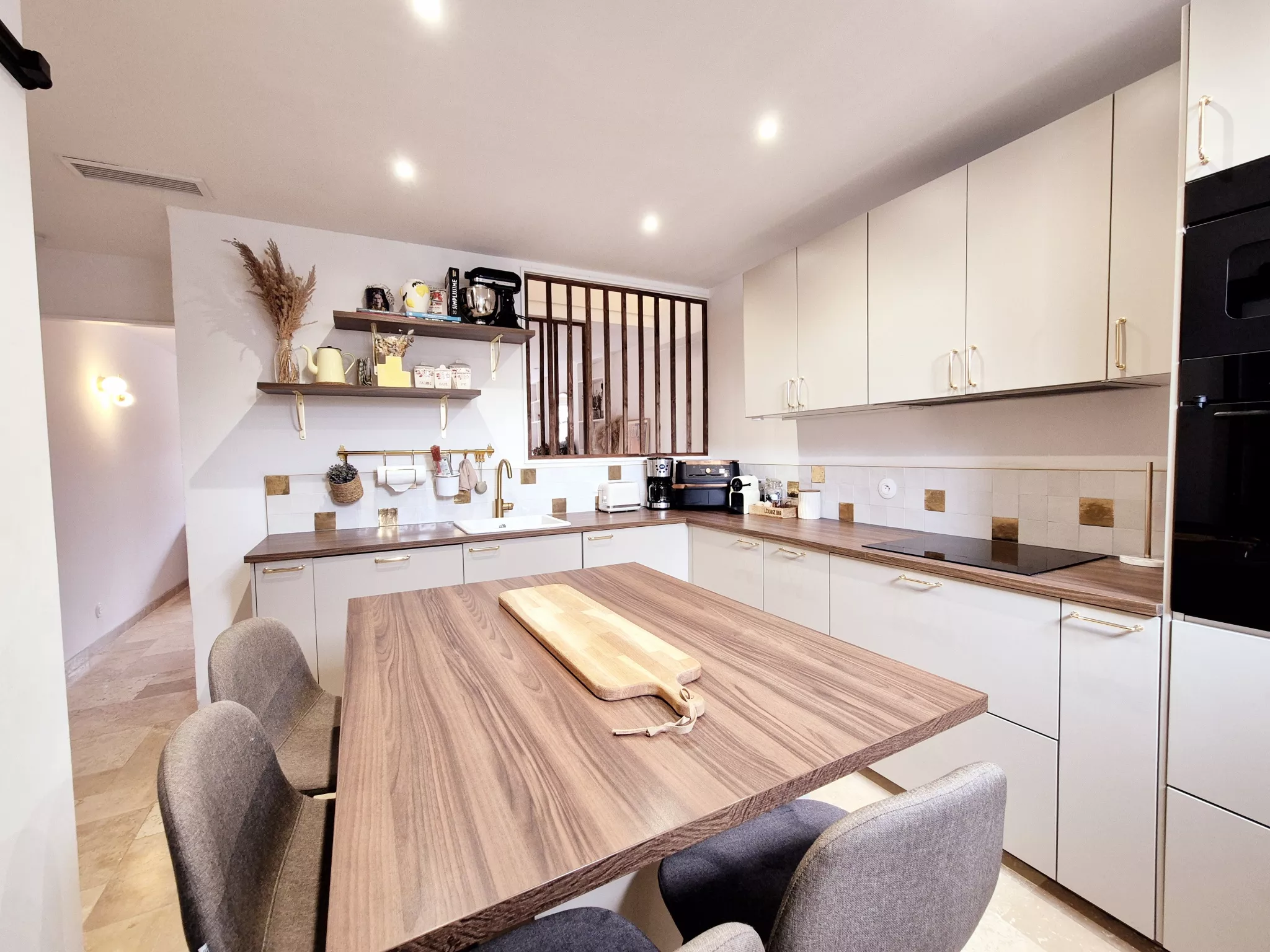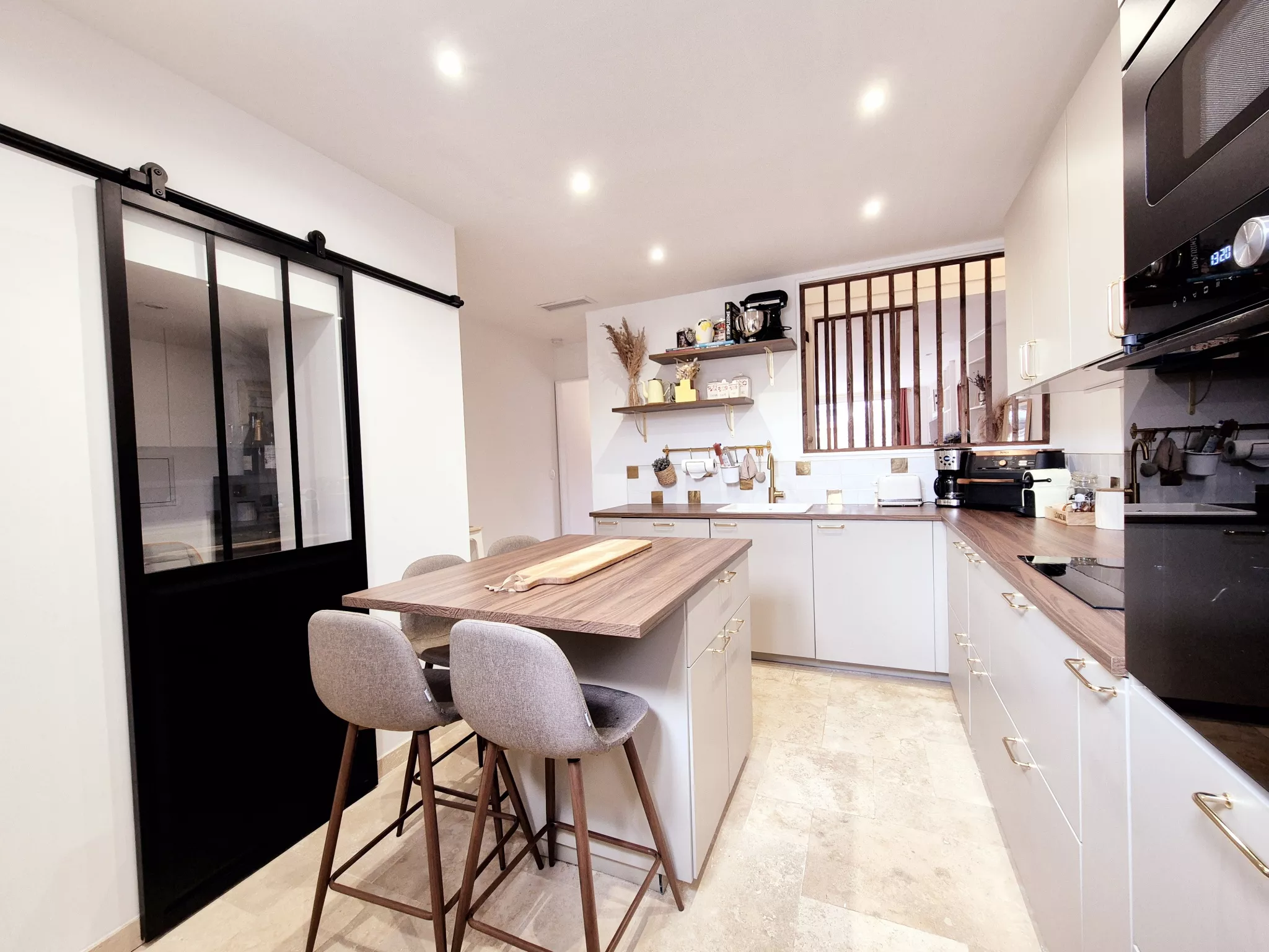 Le séjour, habillé d'un magnifique travertin, dégage une atmosphère chaleureuse et raffinée. Les rangements sur mesure, parfaitement intégrés, optimisent l'espace avec goût et praticité. La cuisine indépendante, conviviale et fonctionnelle, permet de conserver un lien naturel avec la pièce de vie tout en offrant un véritable espace dédié.