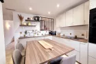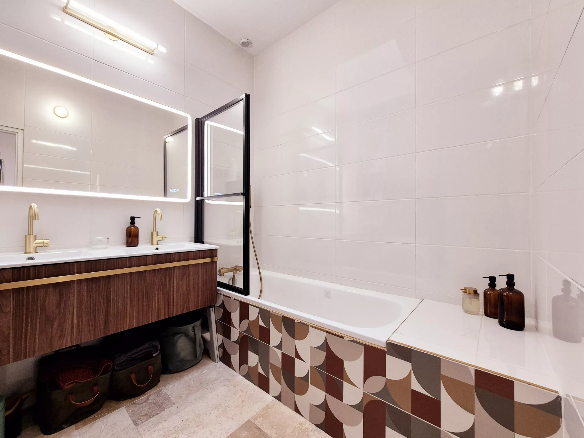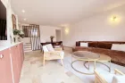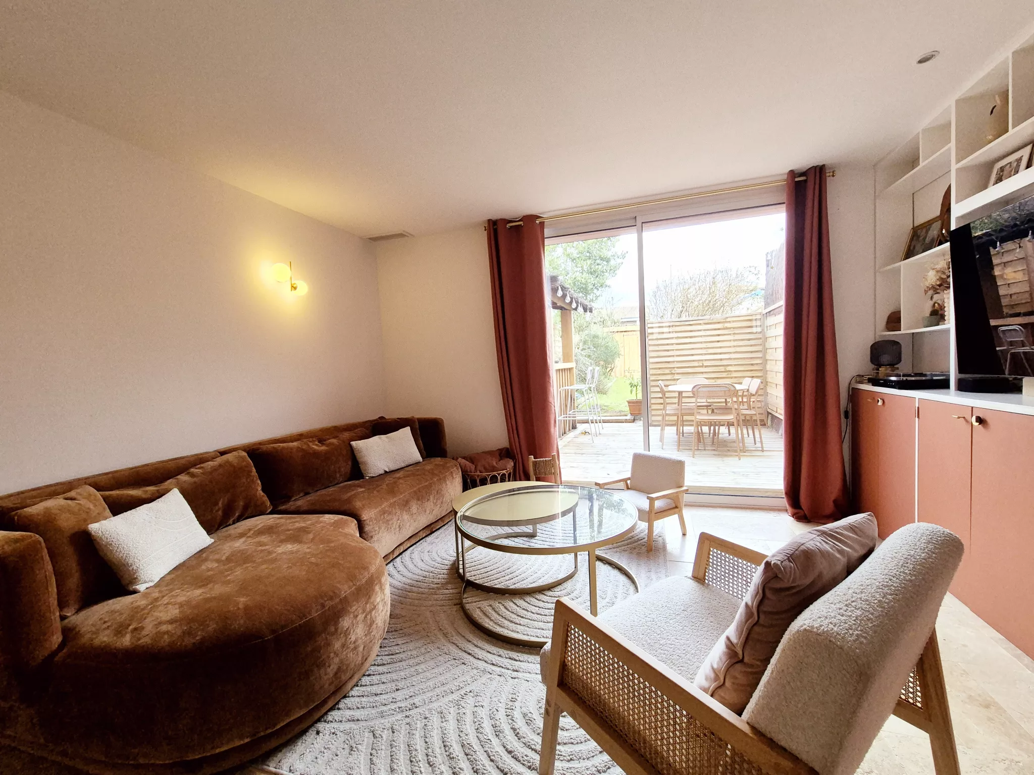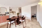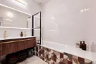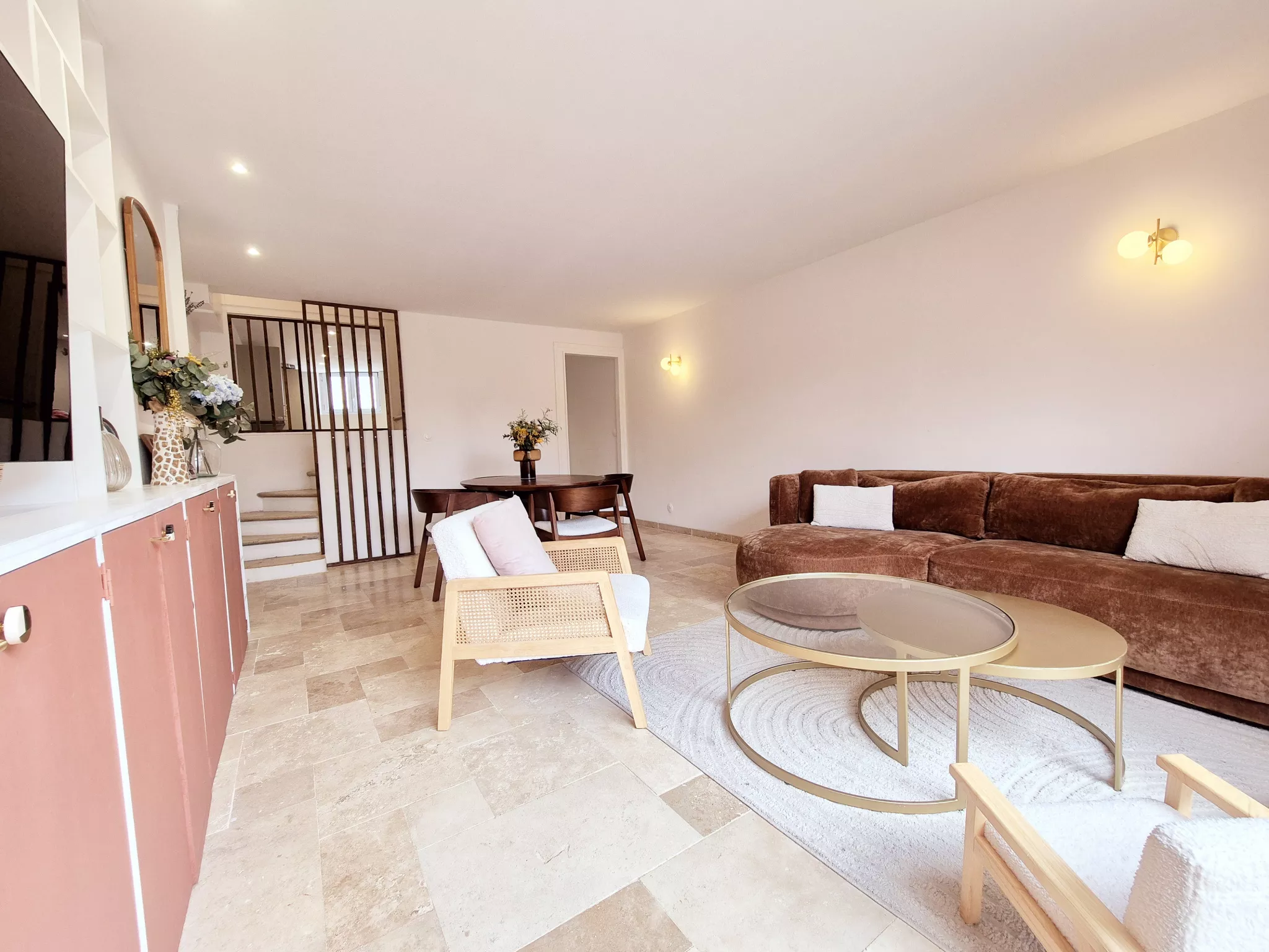 Le séjour, habillé d'un magnifique travertin, dégage une atmosphère chaleureuse et raffinée. Les rangements sur mesure, parfaitement intégrés, optimisent l'espace avec goût et praticité. La cuisine indépendante, conviviale et fonctionnelle, permet de conserver un lien naturel avec la pièce de vie tout en offrant un véritable espace dédié.