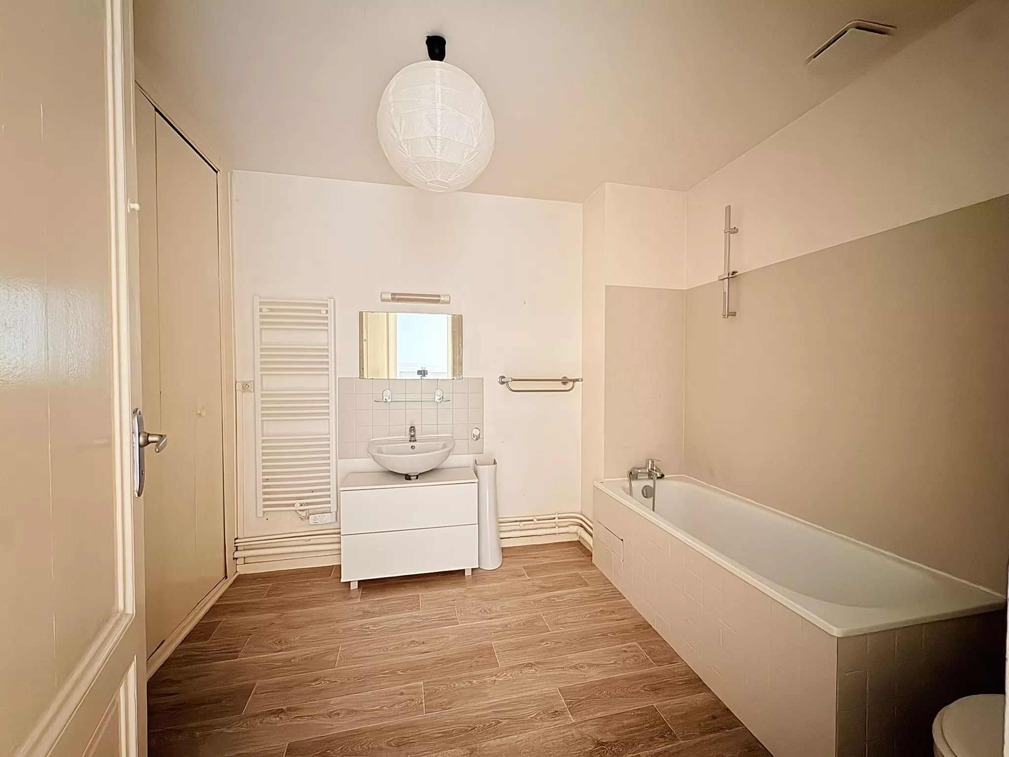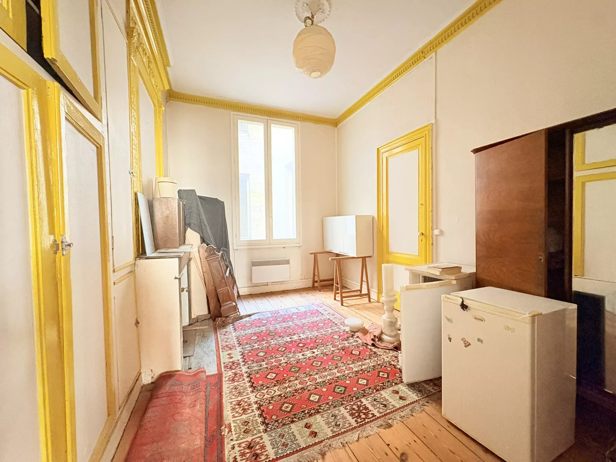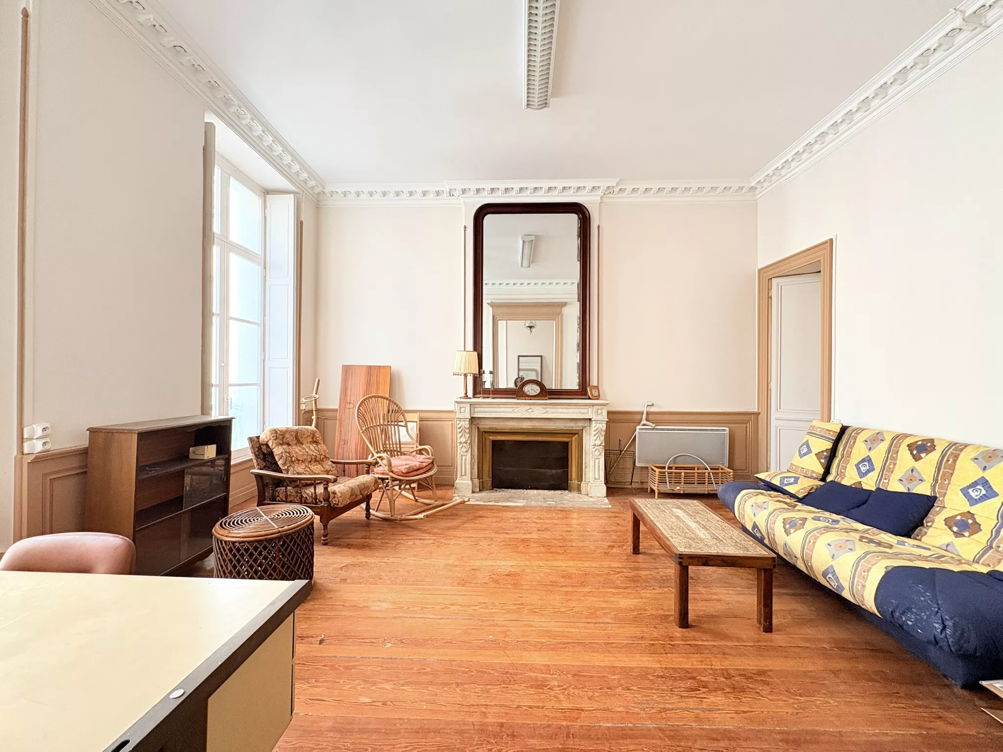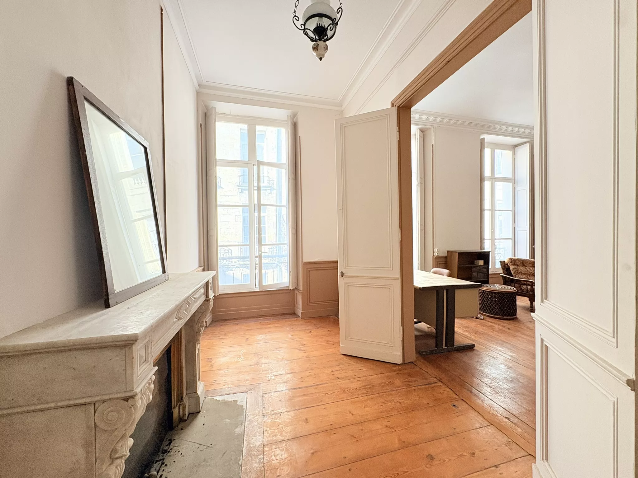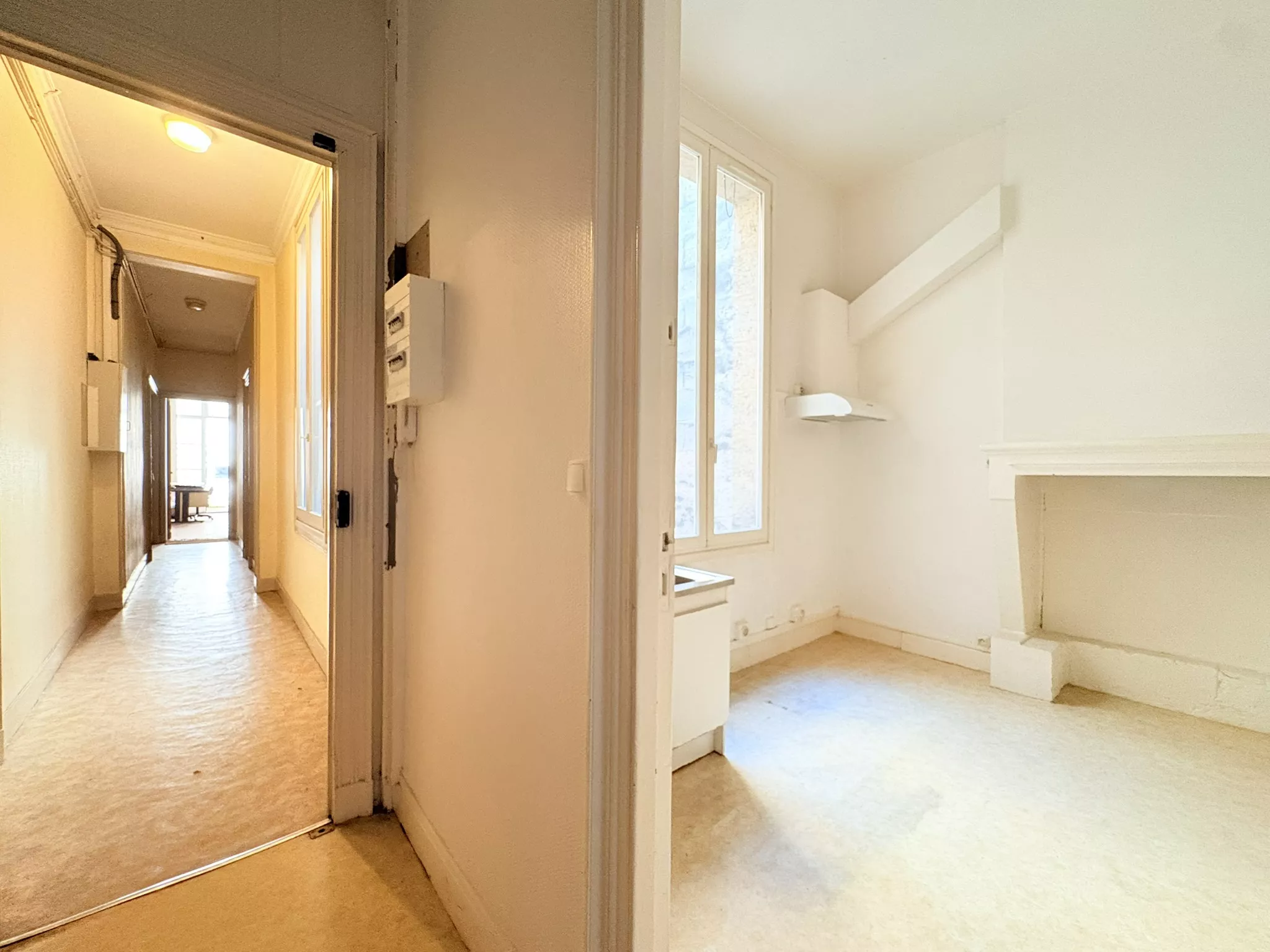 Côté rue, un ancien espace de bureaux à usage commercial propose trois grandes pièces aux prestations anciennes très appréciées : belle hauteur sous plafond, cheminée en marbre, plancher et porte-fenêtres ouvrant sur un balcon. Cet espace, de par son usage, peut également convenir à un projet professionnel ou à une location saisonnière de type courte durée (Airbnb) sous réserve de conformité à la réglementation en vigueur et des autorisations nécessaires. À l'arrière, un appartement de type 2 à rafraichir qui comprend une entrée, une grande pièce dédiée à la cuisine ouverte sur un puits de jour, un salon attenant au sud, une chambre et une grande salle de bains avec toilettes. Un couloir privatif relie les deux ensembles et permet d'imaginer facilement un grand appartement traversant avec 3 chambres, avec un espace de vie à l'avant et un espace nuit au calme à l'arrière, ou bien la reconstitution de deux appartements indépendants.