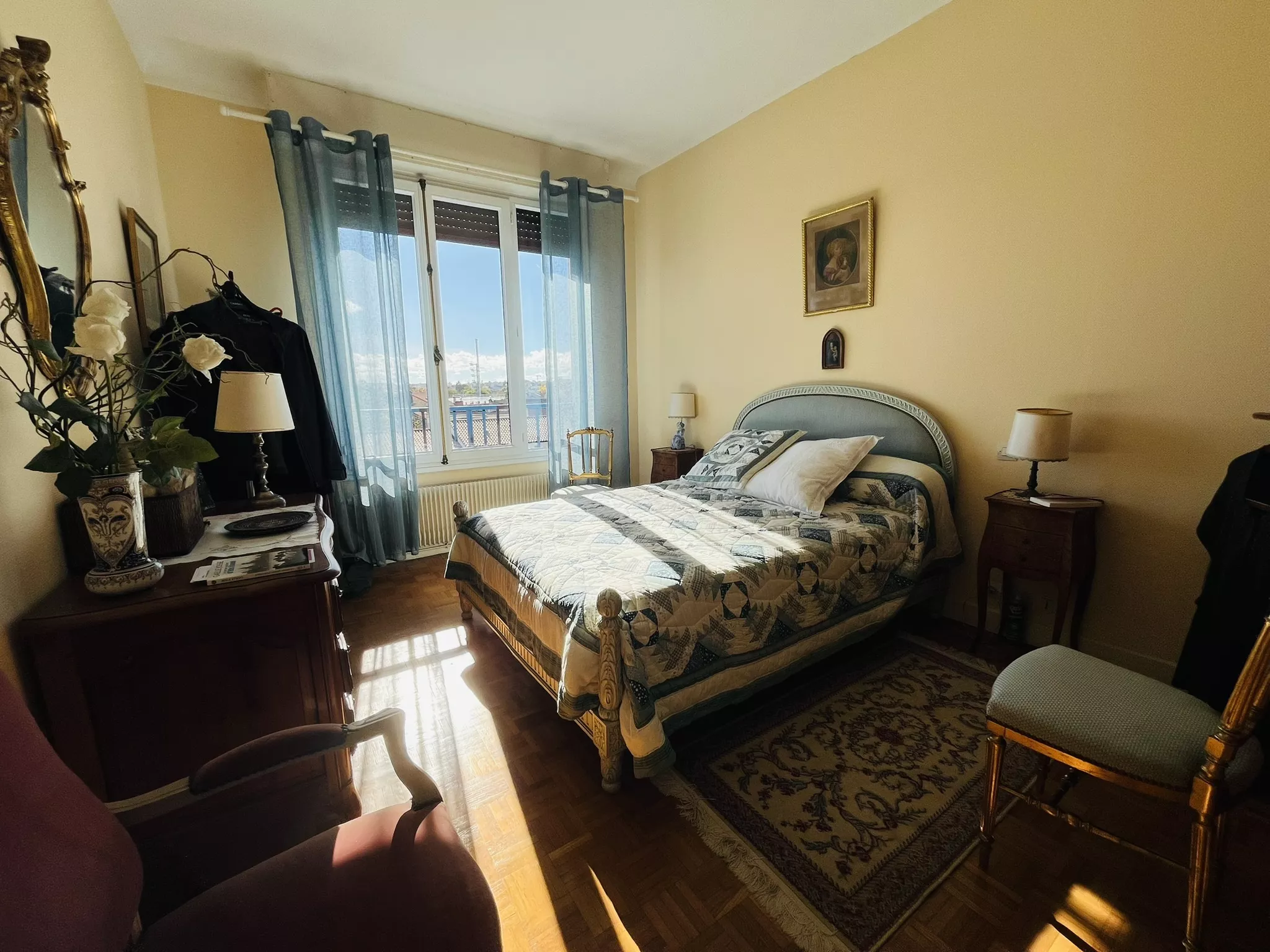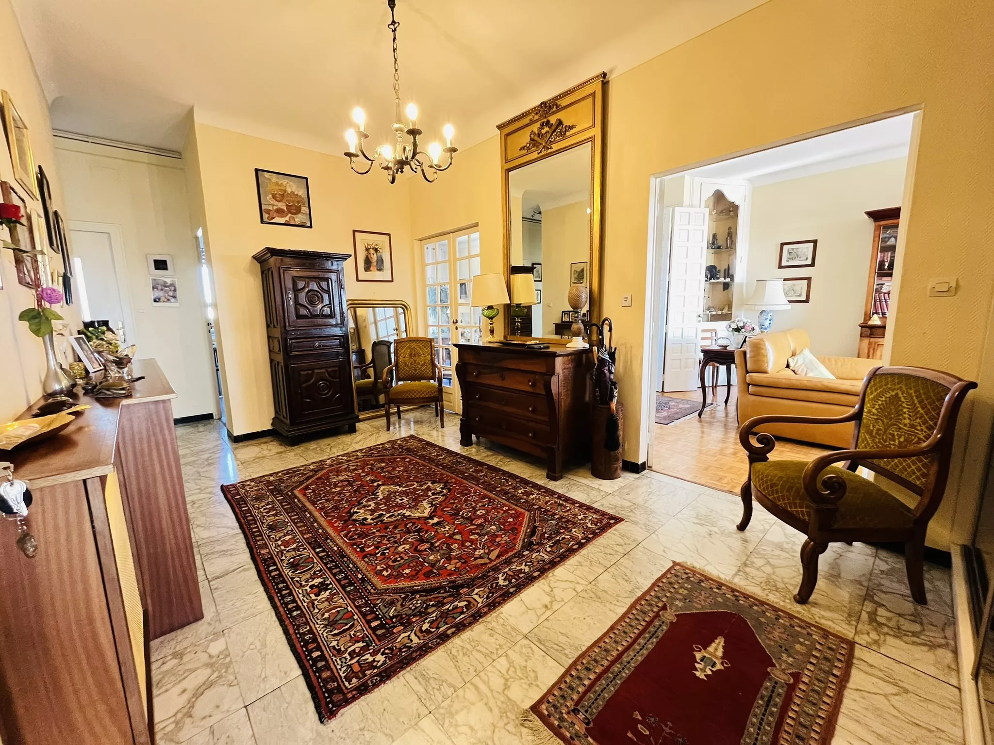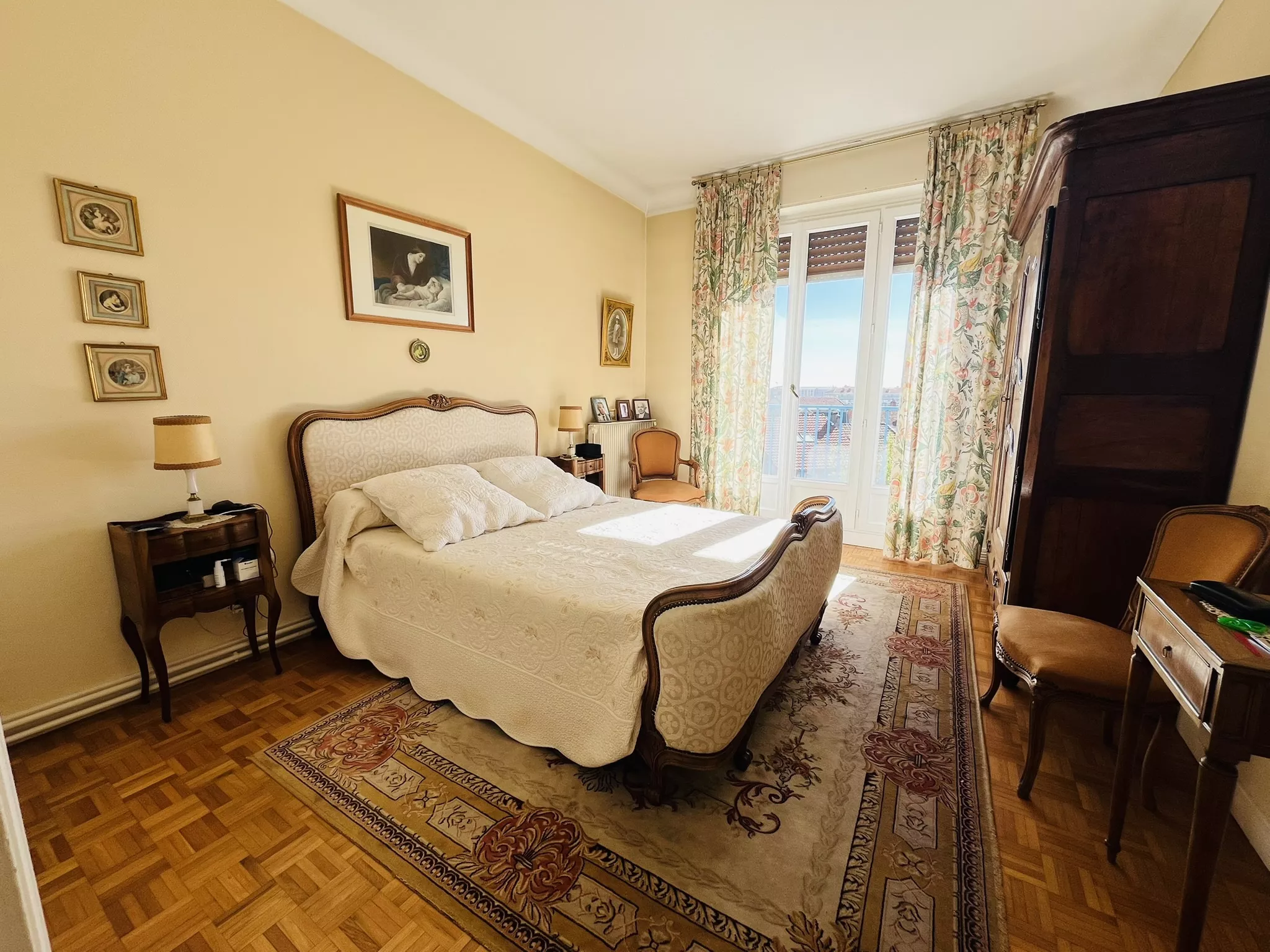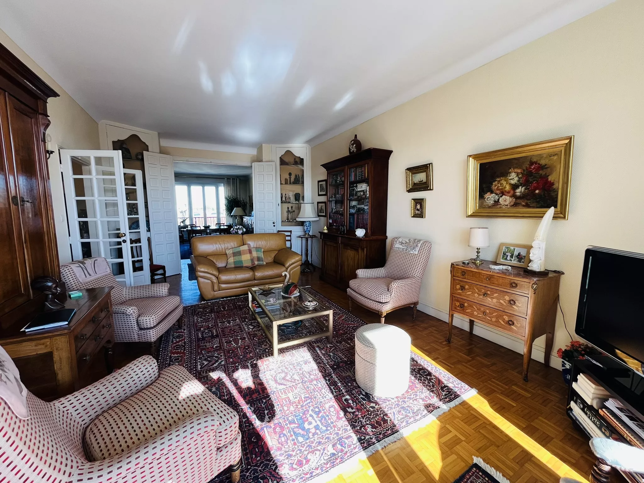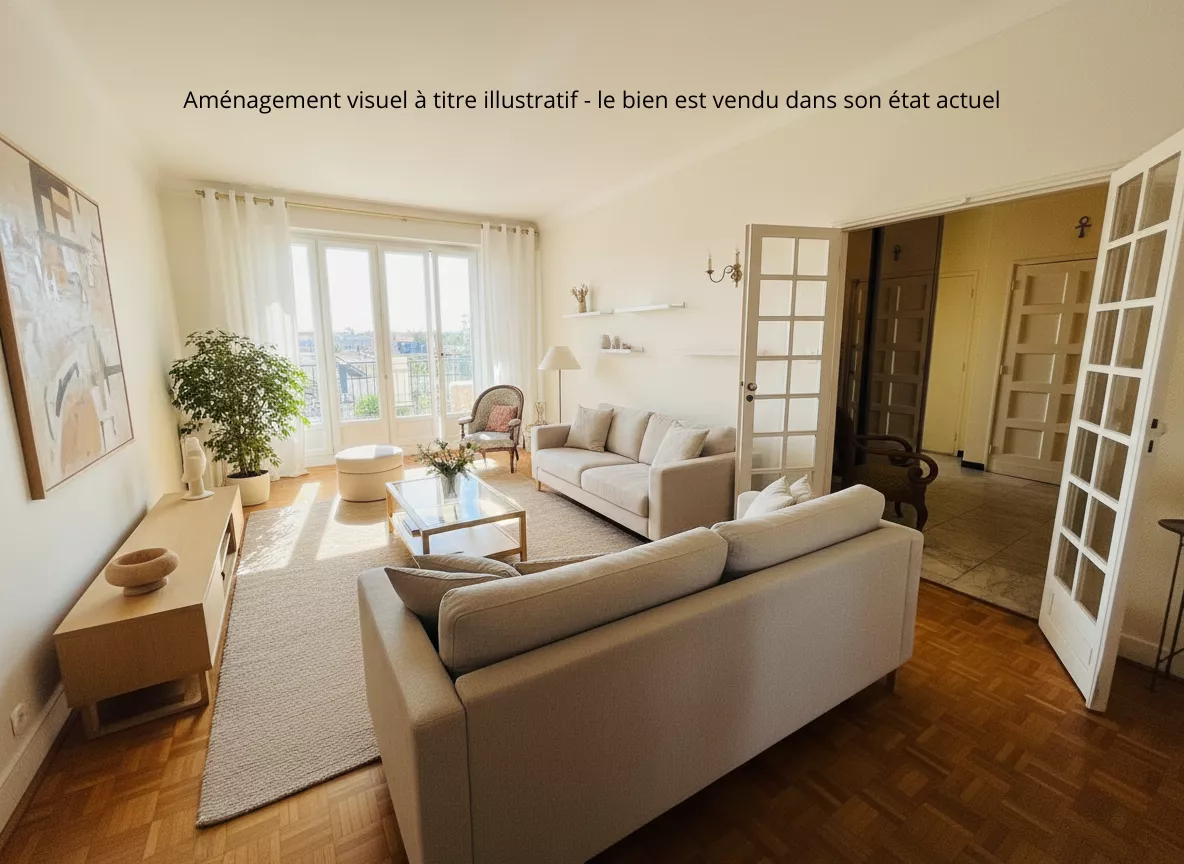 L'appartement s'ouvre sur une vaste entrée avec placards et se compose d'un salon-séjour traversant avec cheminée et deux balcons, d'une cuisine équipée, de trois chambres, dont une avec salle d'eau et WC privatifs, d'une seconde salle d'eau ainsi que d'un WC indépendant.