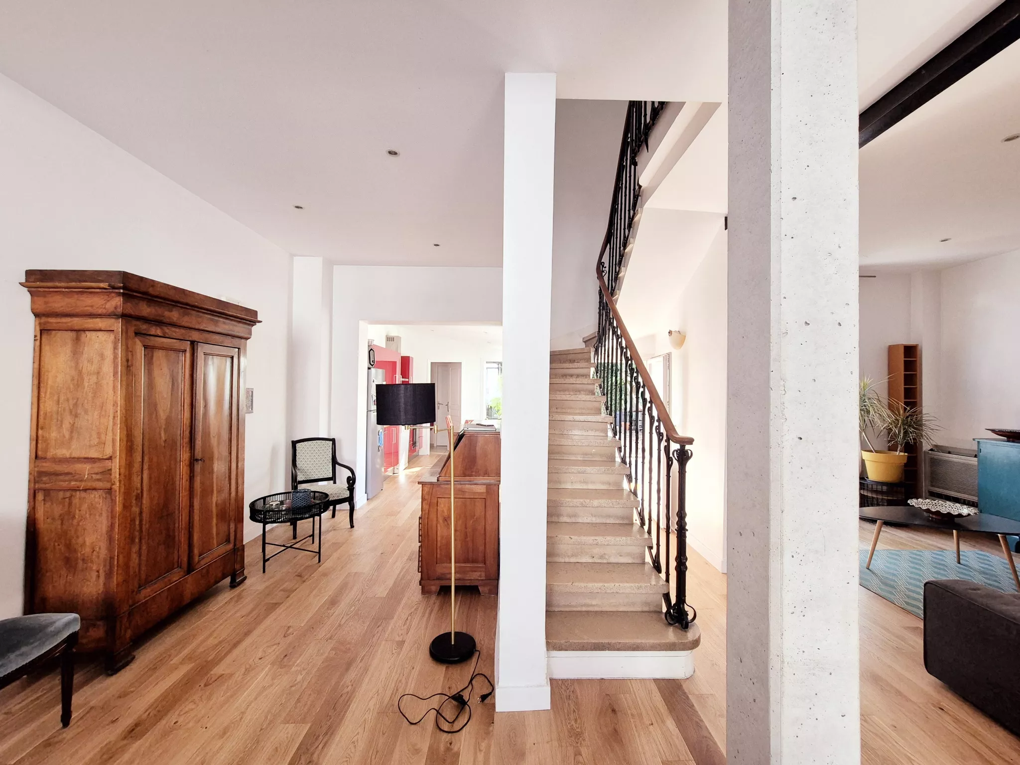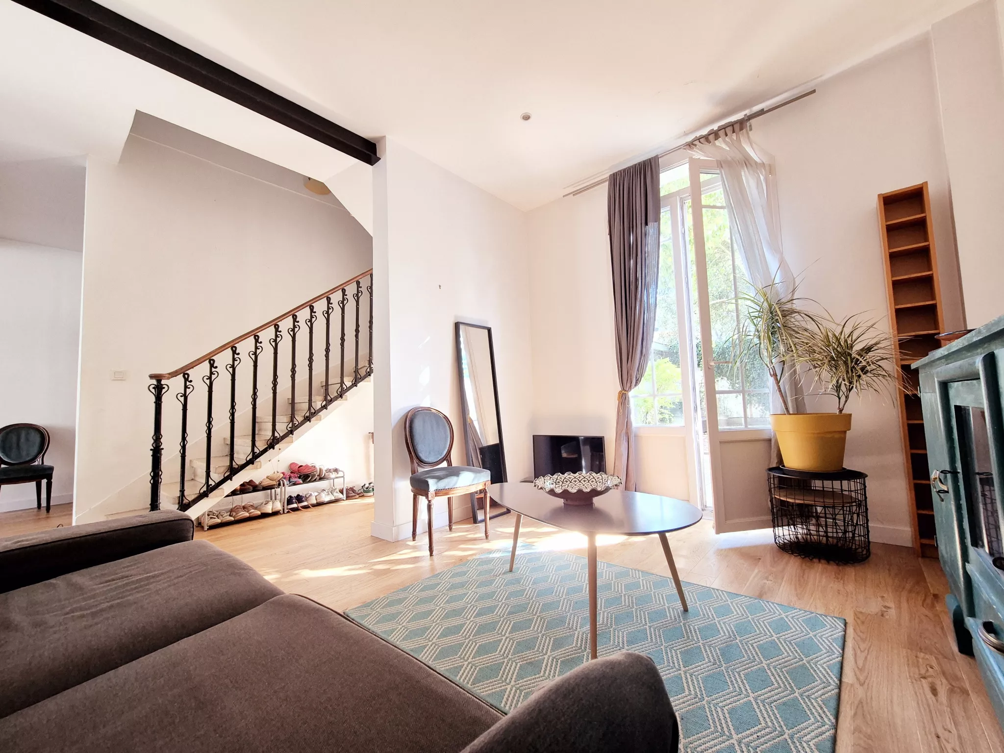 Elle se compose au rez-de-chaussée d'une grande pièce de vie traversante, spacieuse et lumineuse, composée d'un espace salon, un espace bureau et d'une cuisine dinatoire s'ouvrant sur une terrasse et jardin à l'abri des regards, au SUD.