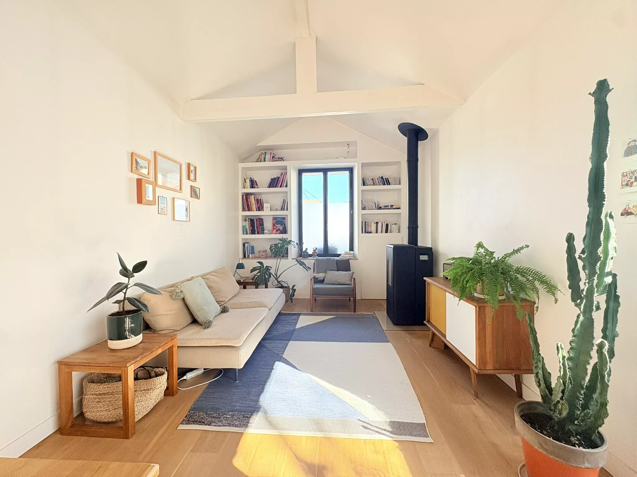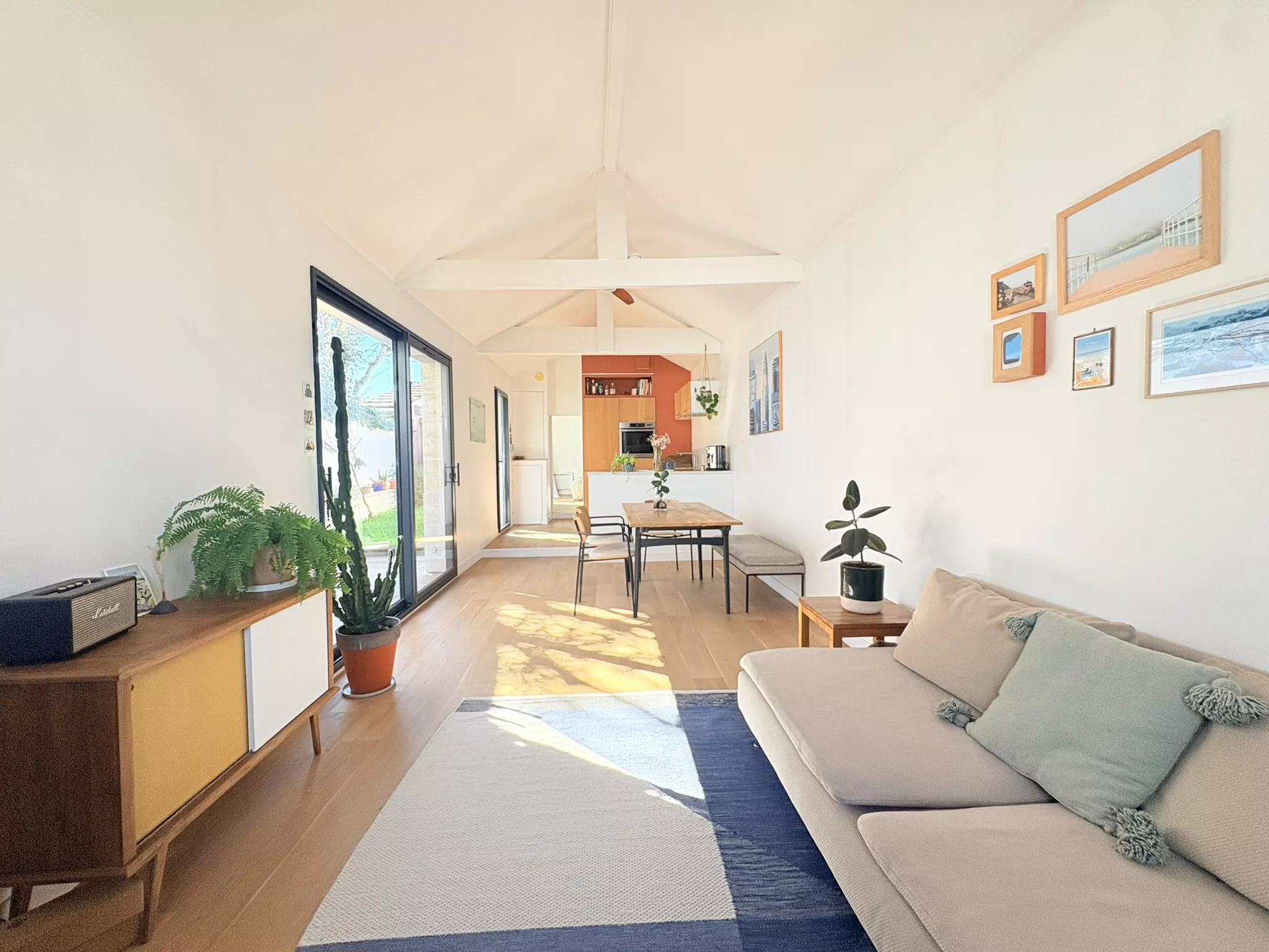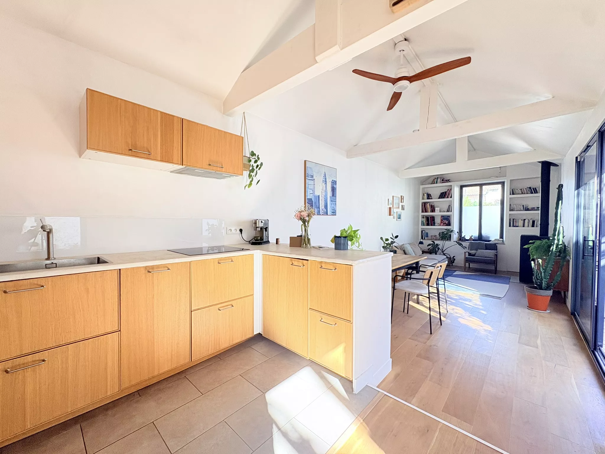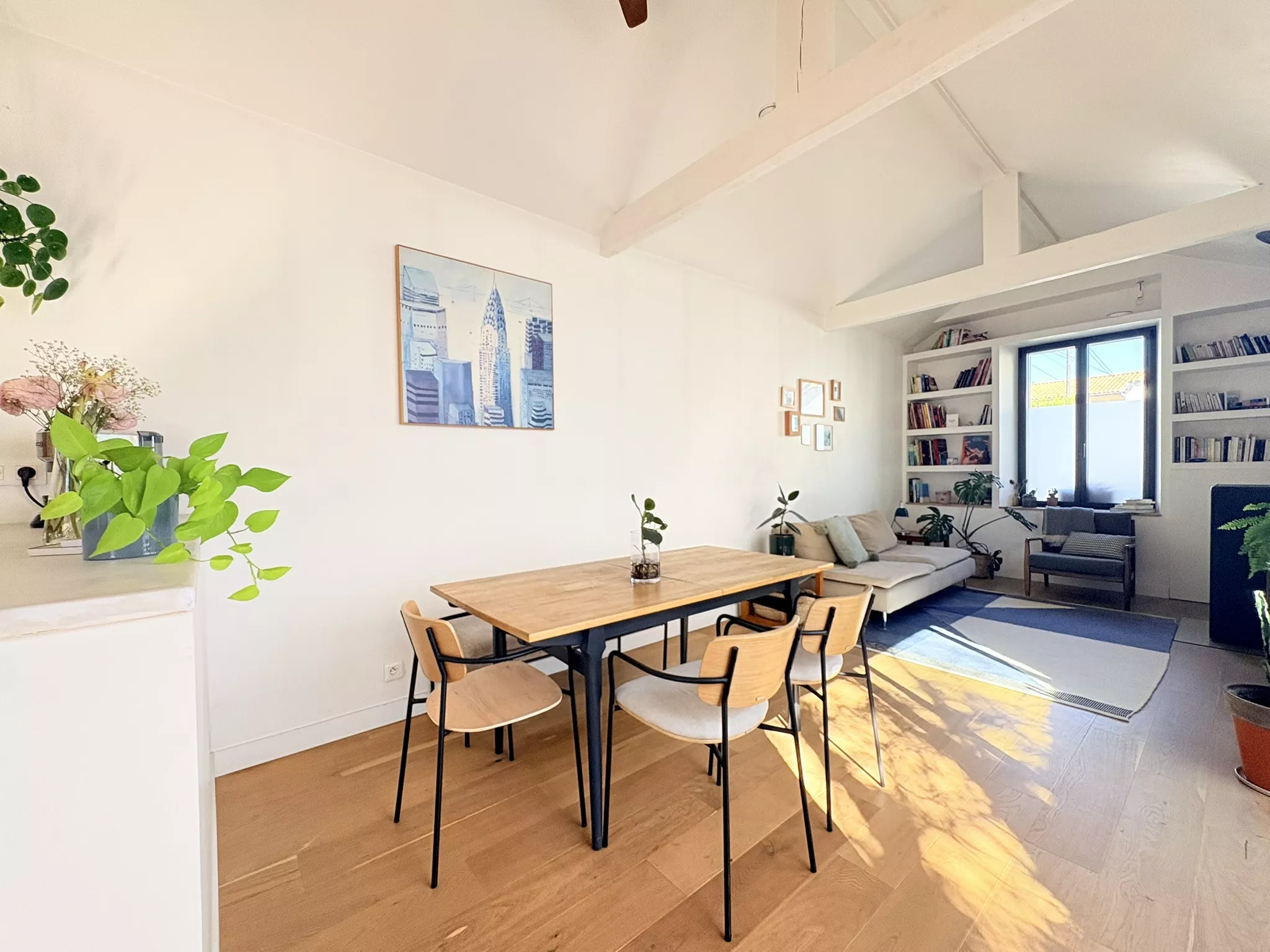 Dès l'entrée, le regard est capté par la majesté des plafonds rampants qui confèrent à l'espace de vie un volume spectaculaire. Véritable coeur battant de la maison, chaque pièce s'ouvre en toute harmonie sur un jardin intime de quarante mètres carrés, offrant un havre de paix insoupçonné en plein centre-ville.